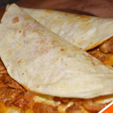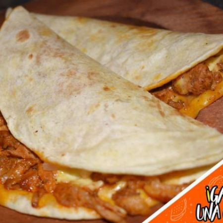Tortilla de harina, con carne al pastor, quesillo, cebolla, cilantro y piña.