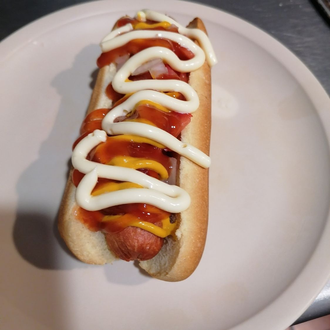 Salchicha, tocino, picante, cebolla frita, tomate, cátsup, mayonesa y mostaza.