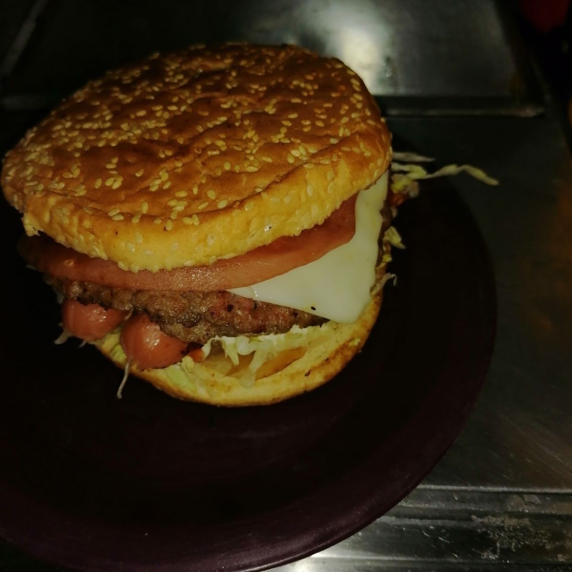 Doble carne de res, jamón, queso amarillo, quesillo, queso manchego, salchicha de pavo, tocino, lechuga, tomate, cebolla frita, catsup, mayonesa y mostaza.