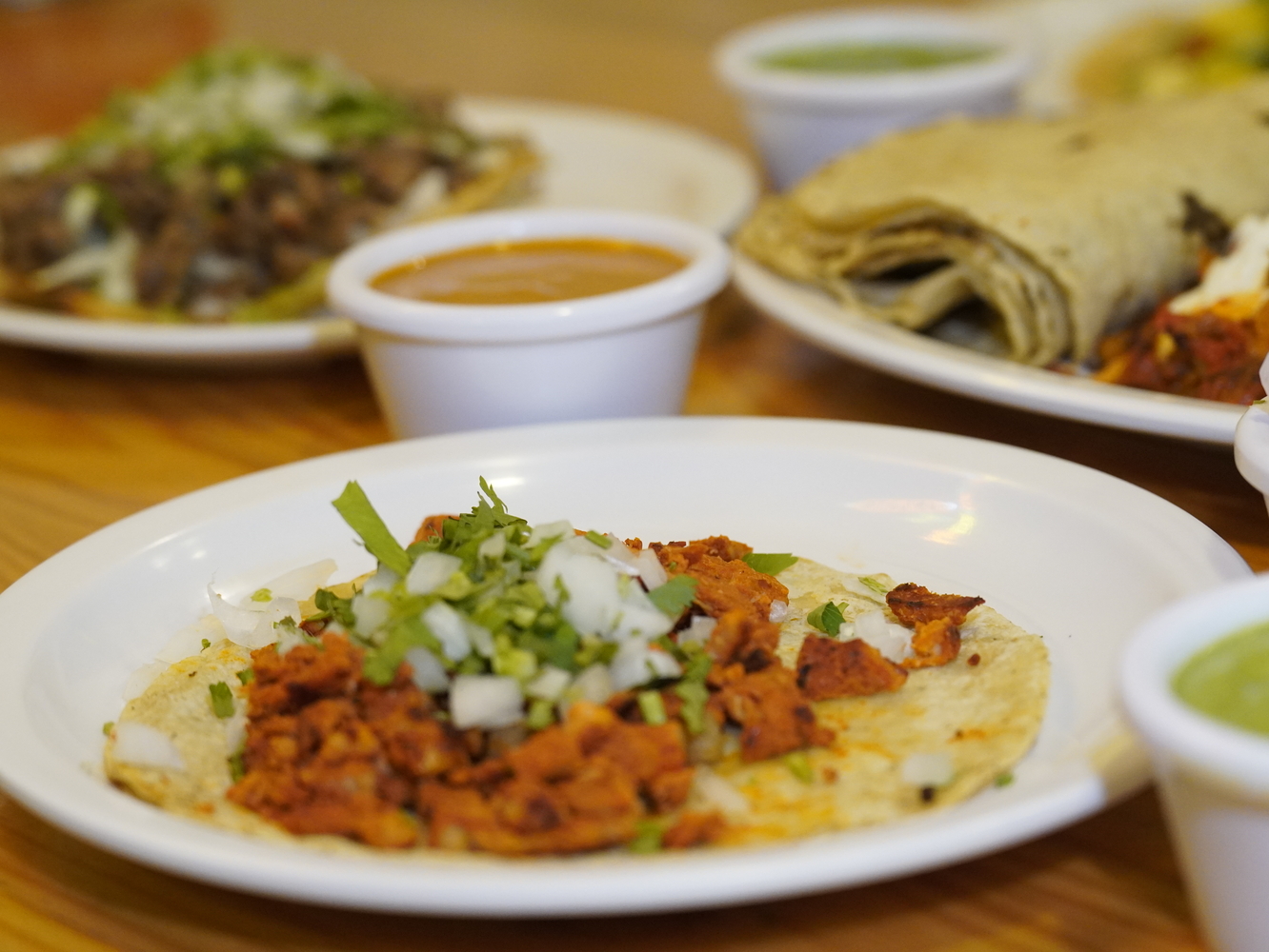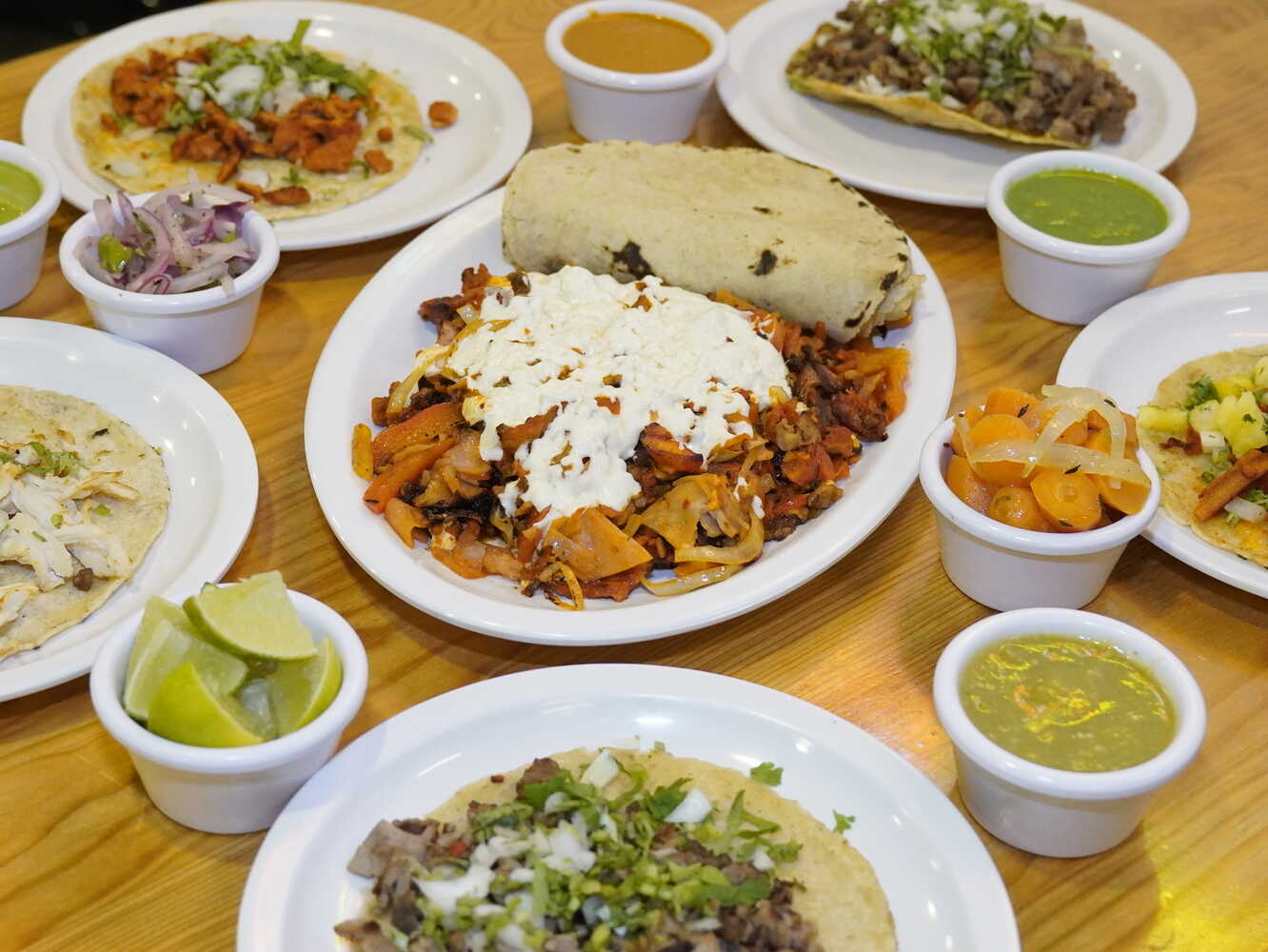 Tortilla de harina, queso fundido y carne al pastor o bistec, cilantro, cebolla y salsa.