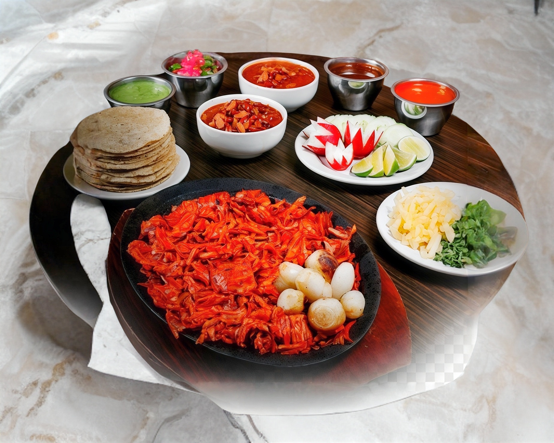 Incluye: guacamole, salsa roja, salsa de piña, pico de gallo, limones, tortillas.