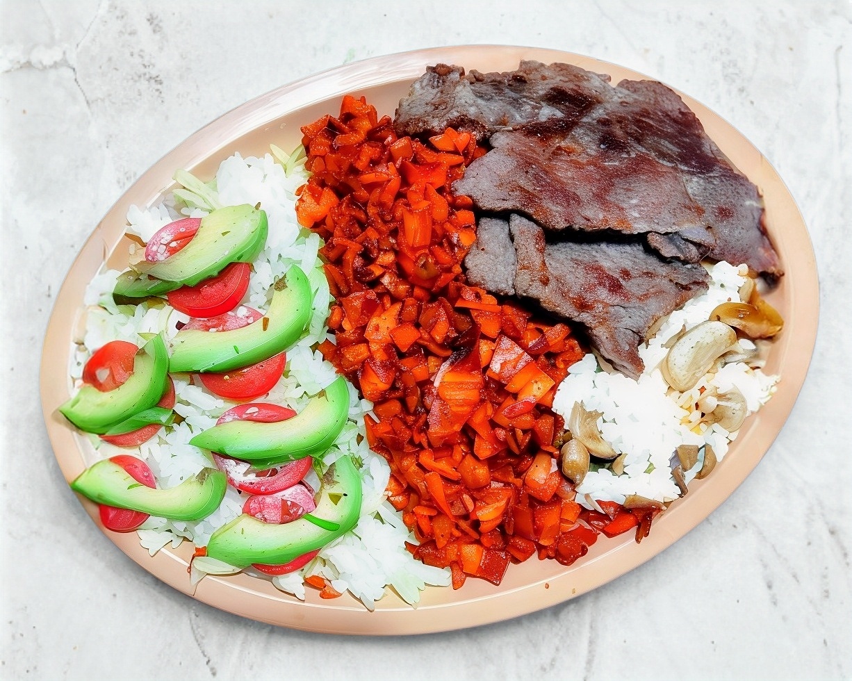 Bistec asado, queso derretido con champiñón, pastor y guarnición.
