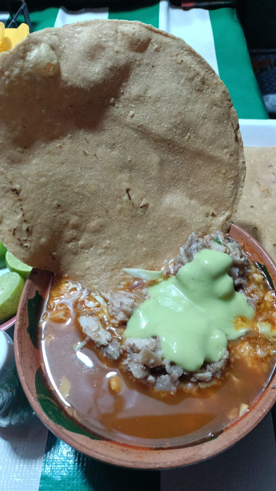 Medio litro aproximadamente de pozole rojo con maciza de res, acompañado con repollo, guacamole, tostadas y salsa (perrona).
