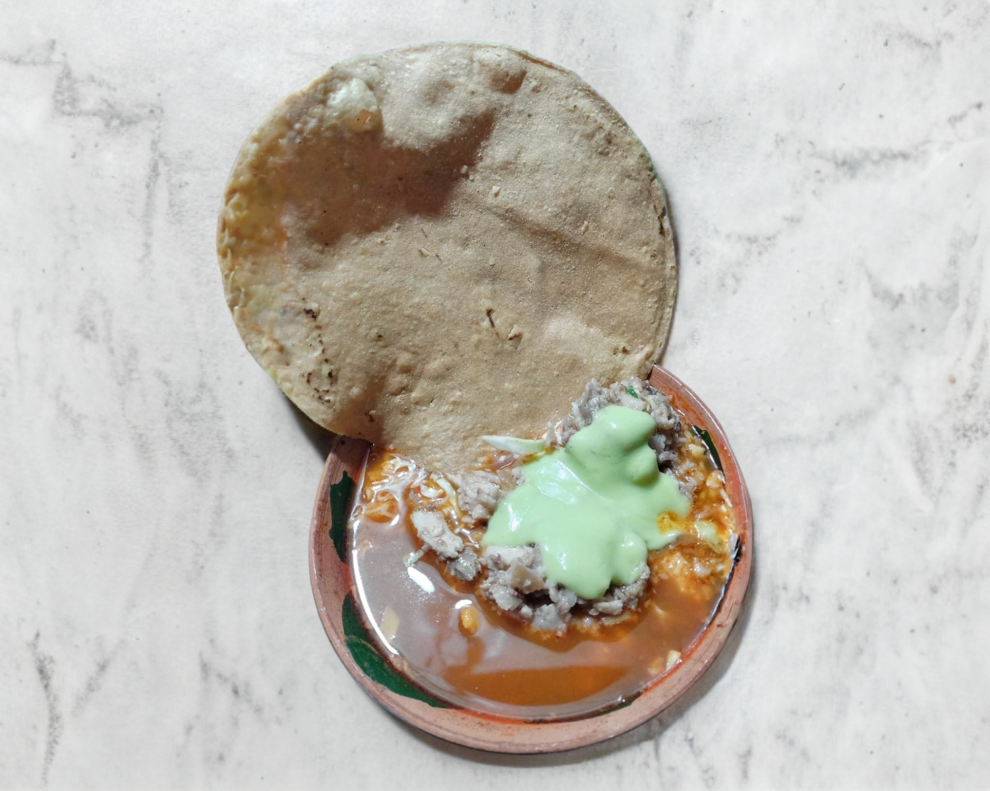 Medio litro aproximadamente de pozole rojo con maciza de res, acompañado con repollo, guacamole, tostadas y salsa (perrona).