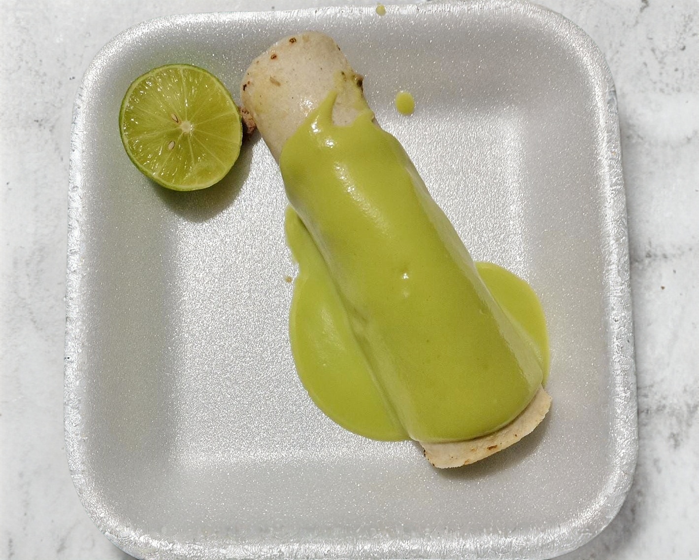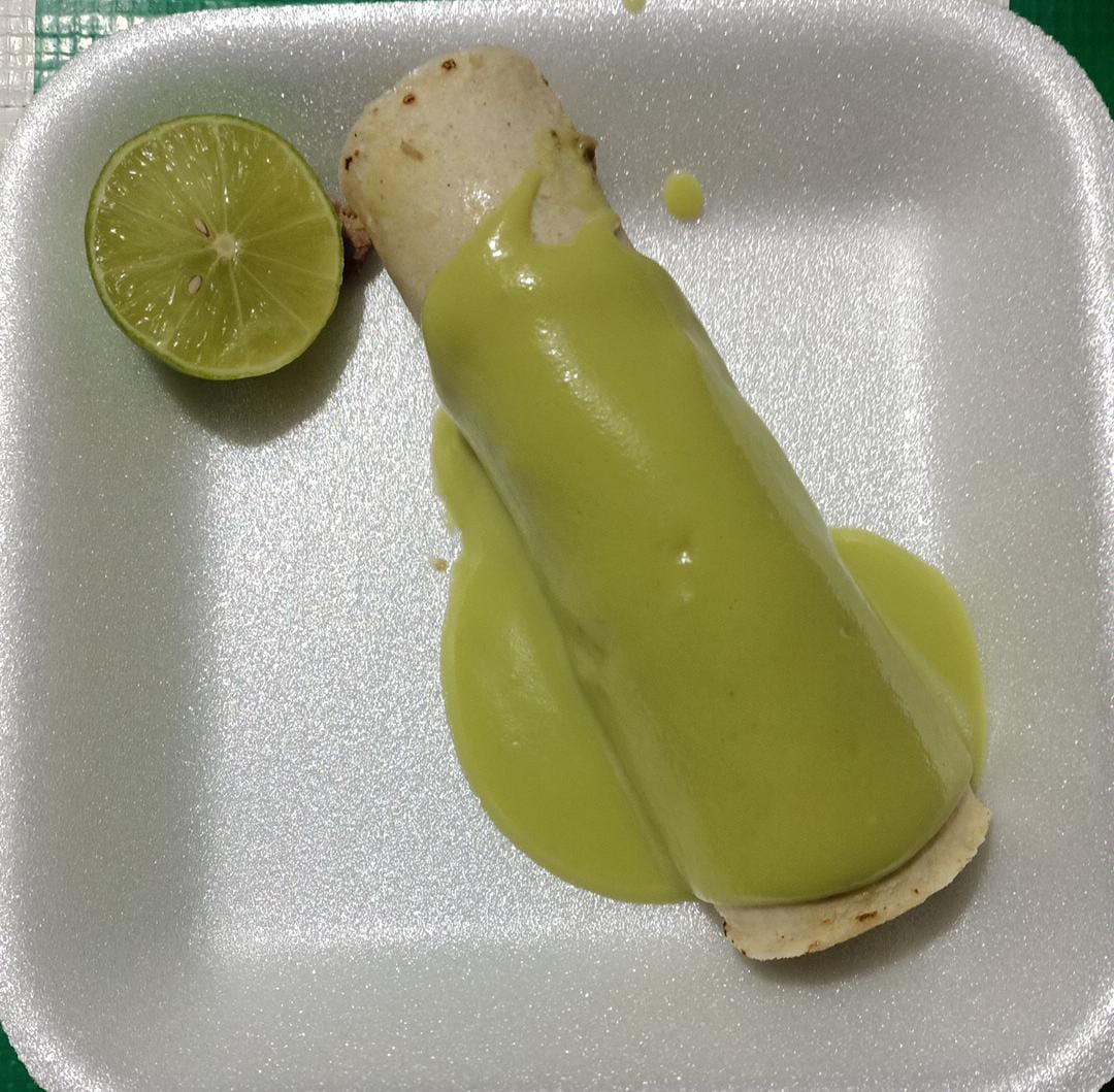 Un taco de maciza de res, acompañado con cebolla, cilantro (combinados), guacamole y salsa (perrona).