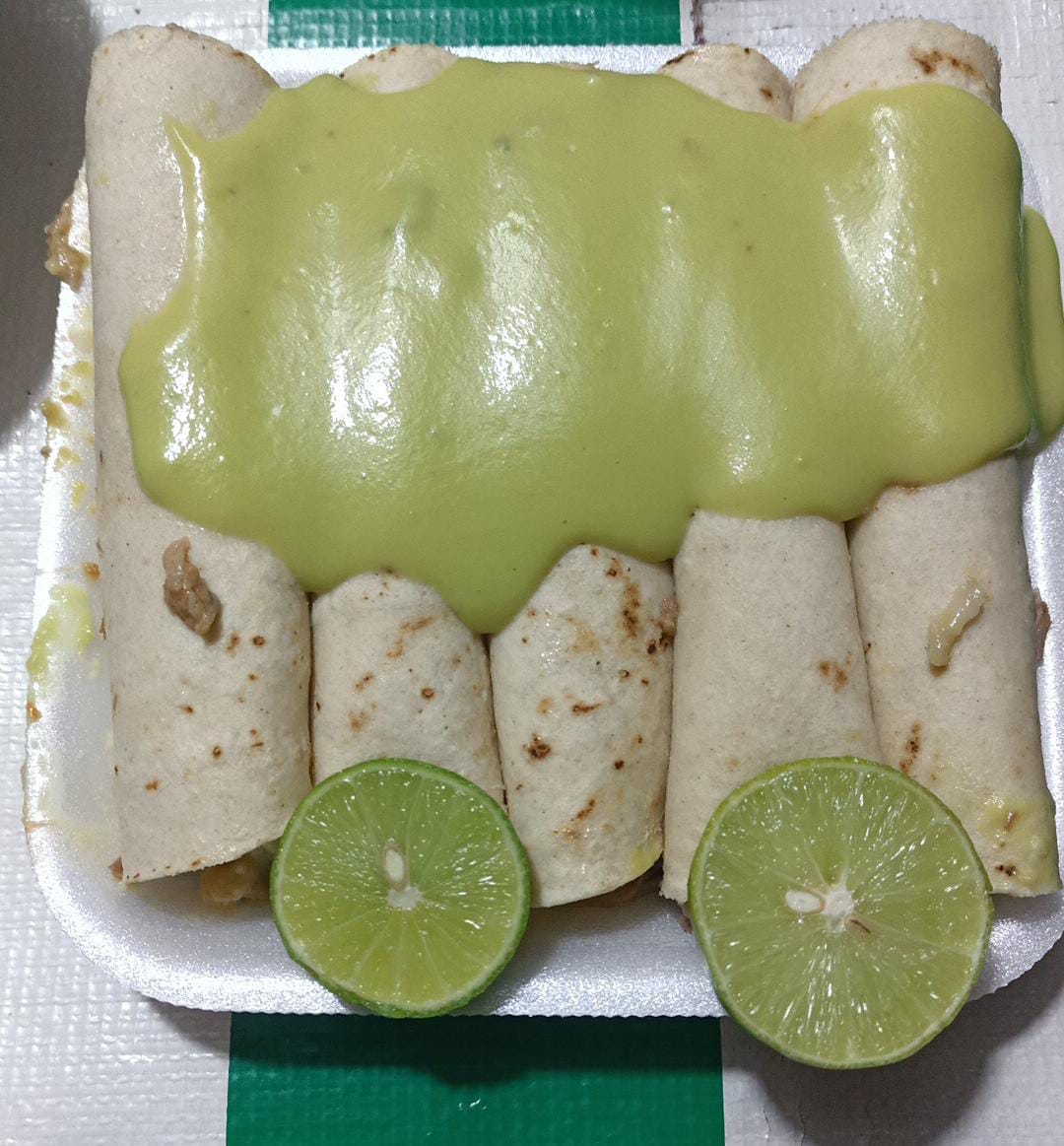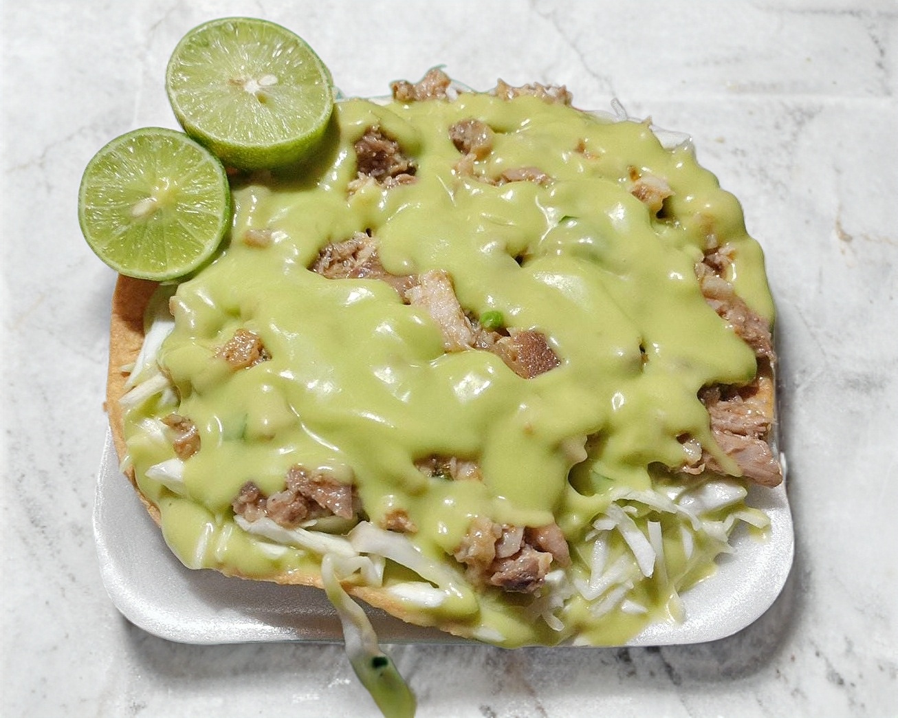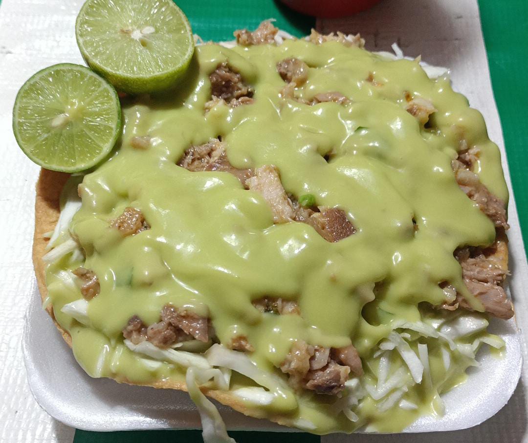 Tostada de maciza de res acompañado con repollo, guacamole y salsa (perrona).