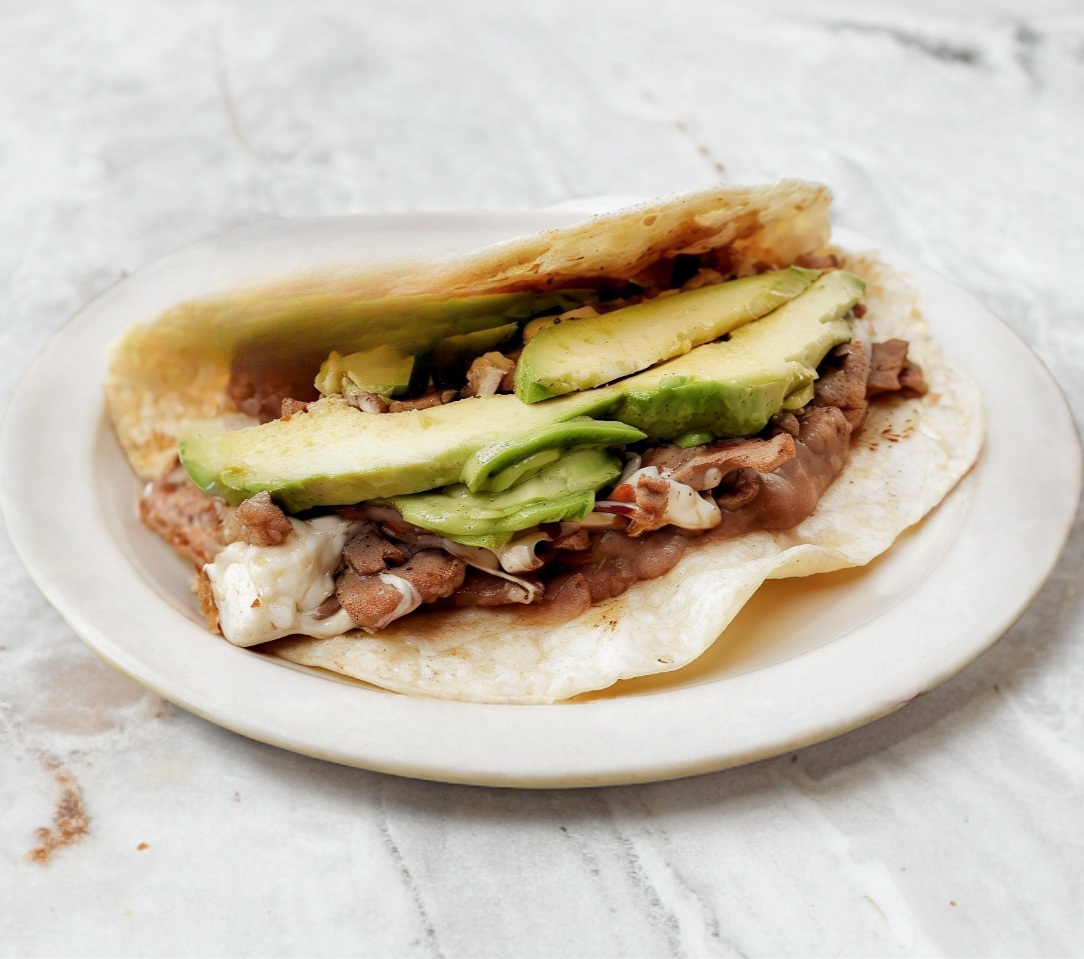 1 tortilla de harina, quesillo, bistec, frijol y aguacate.