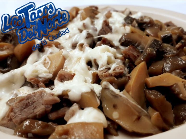 Bistec, champiñones, quesillo, acompañado de tortillas.