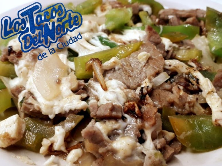Pimiento, cebolla, bistec y quesillo, acompañado de tortillas.