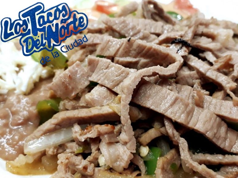 Cebolla, chile jalapeño, bistec, ensalada, frijoles, acompañado de tortillas.