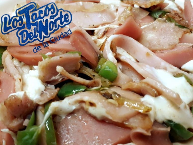 Pimiento, cebolla, jamón, salchicha, tocino y quesillo, acompañado de tortillas..