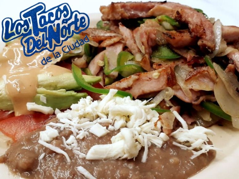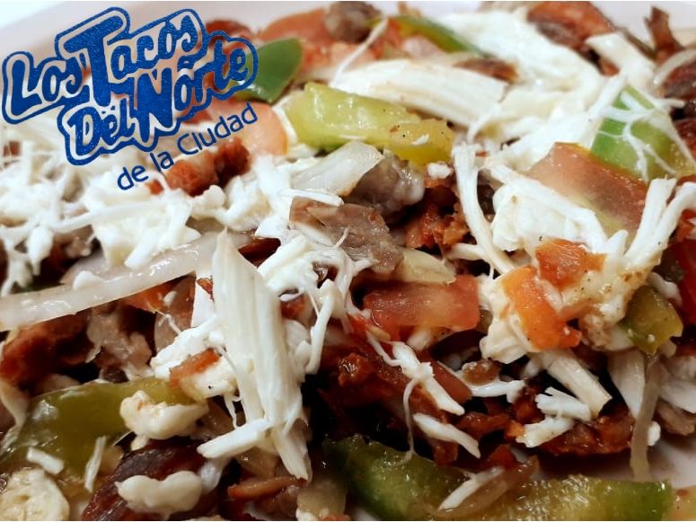 Cebolla, pimiento, tomate, pastor, bistec, quesillo, acompañado de tortillas.