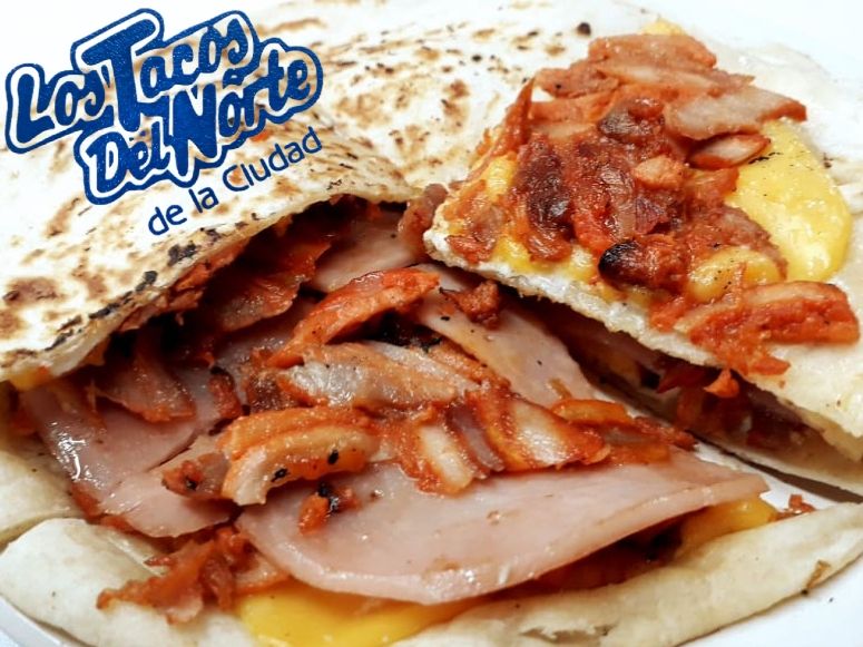 2 tortillas de harina, quesillo, jamón, queso amarillo y carne al pastor.
