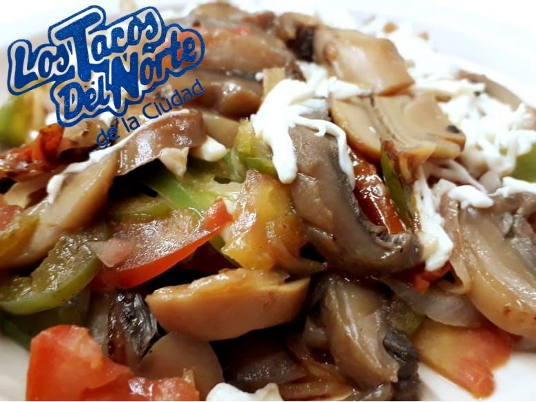 Pimiento, cebolla, tomate, champiñones y quesillo, acompañado de tortillas.