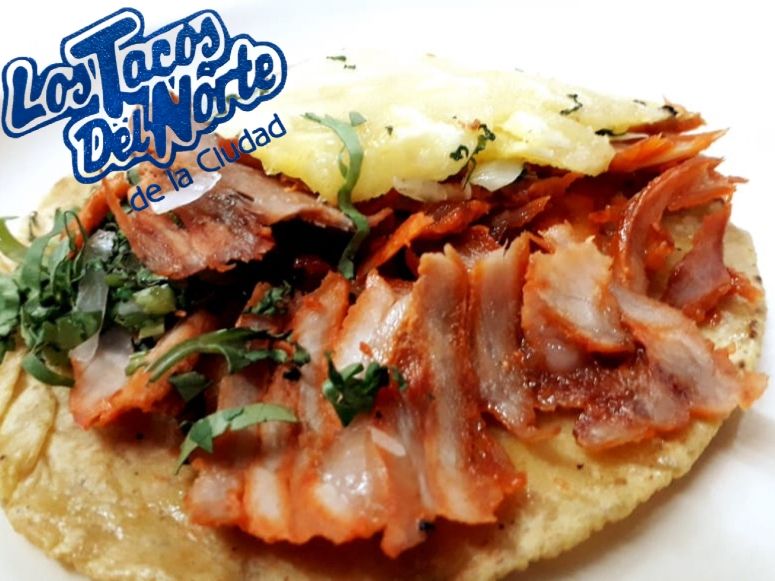 Tortilla de maíz, carne al pastor, cilantro, cebolla y piña.