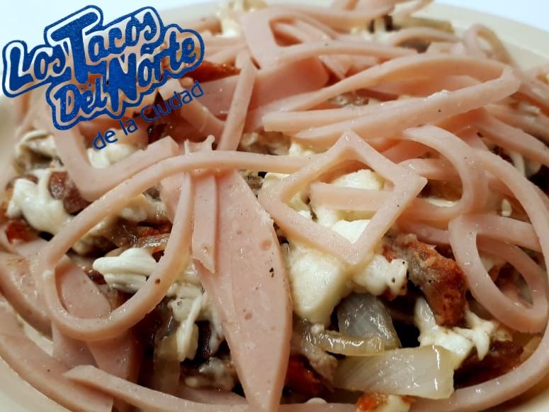 Cebolla, quesillo, pastor, bistec, jamón, acompañado de tortillas.