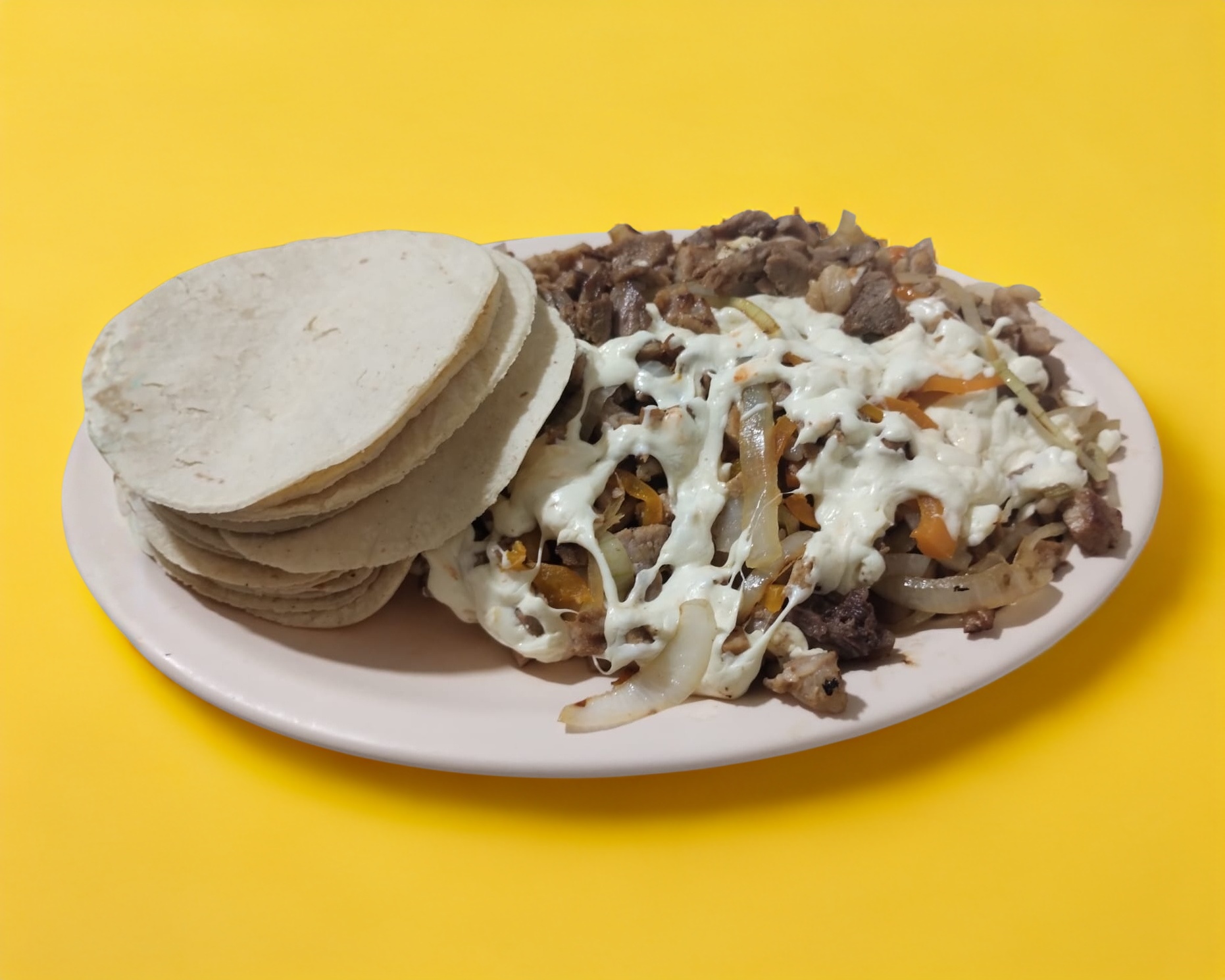 Carne al pastor, cebolla, morrón, y quesillo