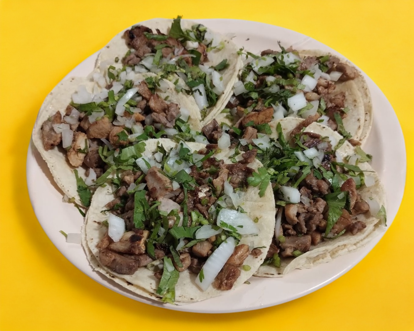 Tortilla de maíz con carne de chuleta, acompañada de cilantro y cebolla.