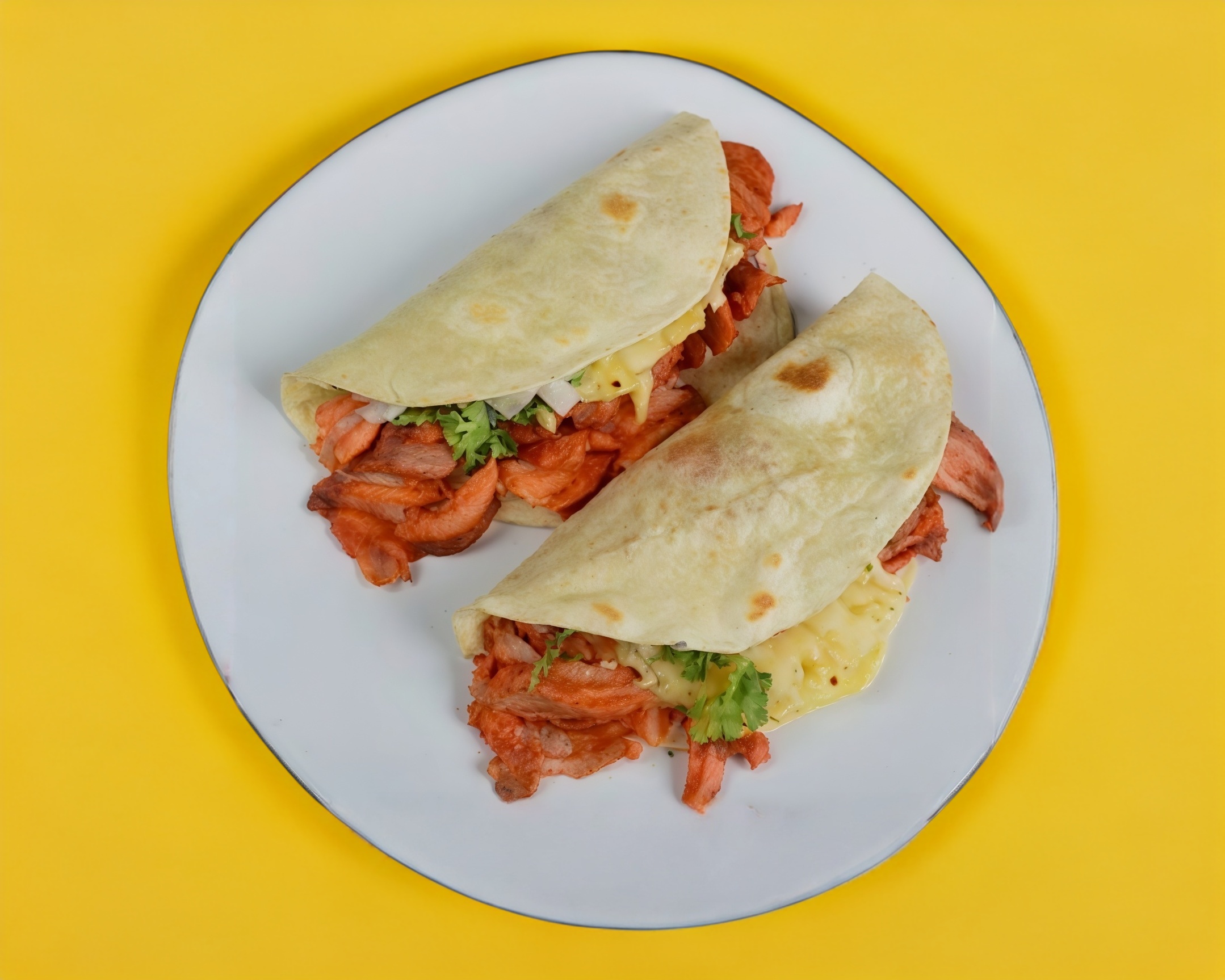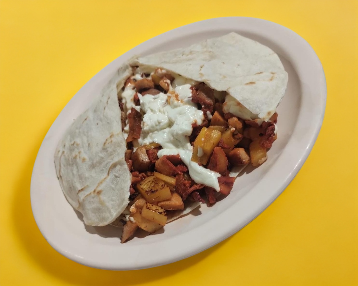 Doble tortilla de harina con pastor, bistec, piña y jamón.