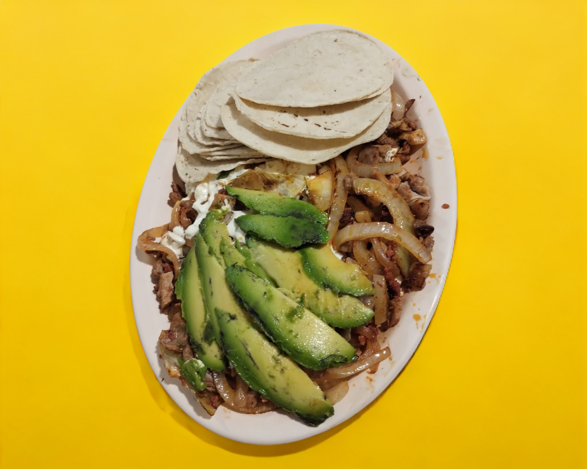Bistec, chorizo, tocino, cebolla, tomate, aguacate y quesillo.