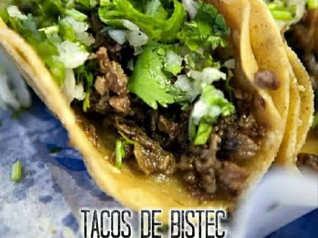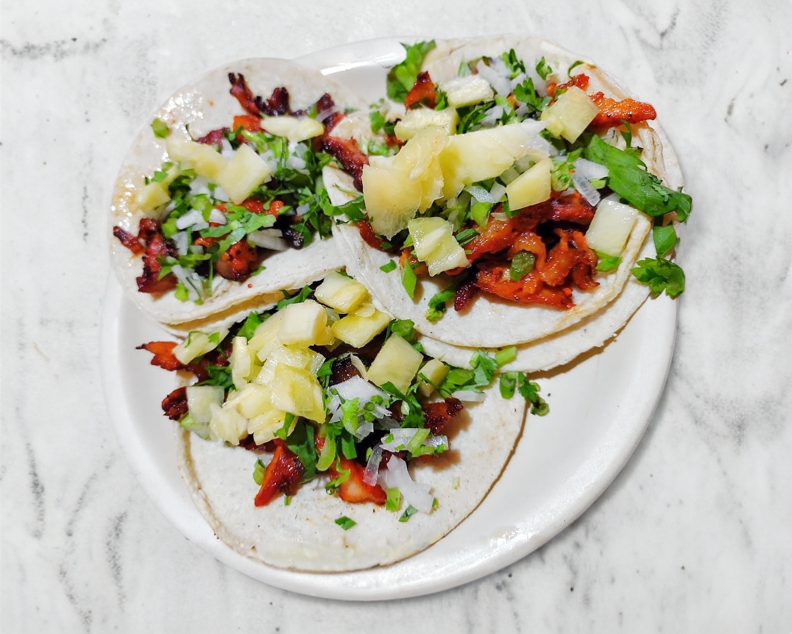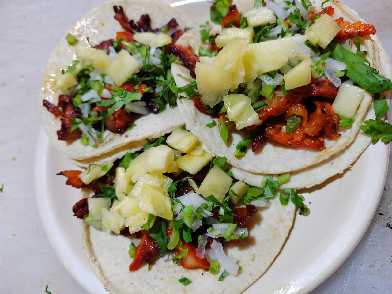 Bistec, pastor, cebolla, poblano y queso fundido.