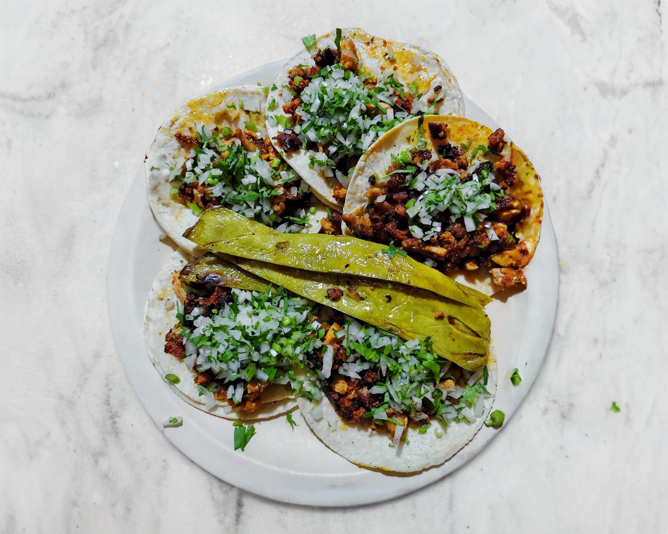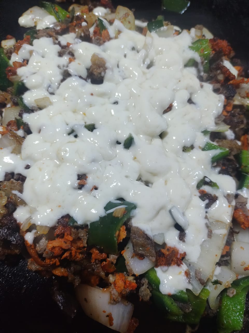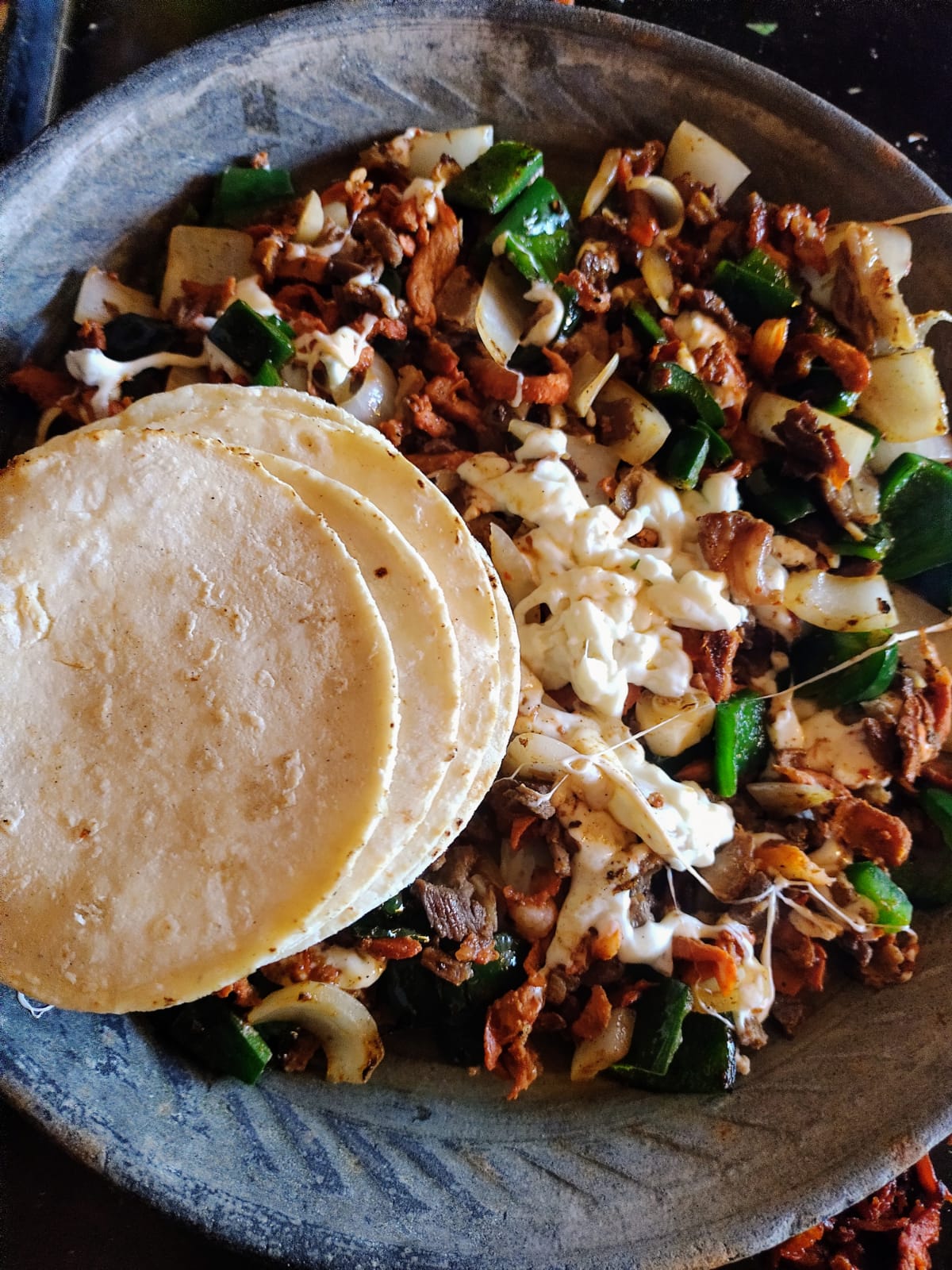Bistec, pastor, cebolla, poblano y queso fundido.