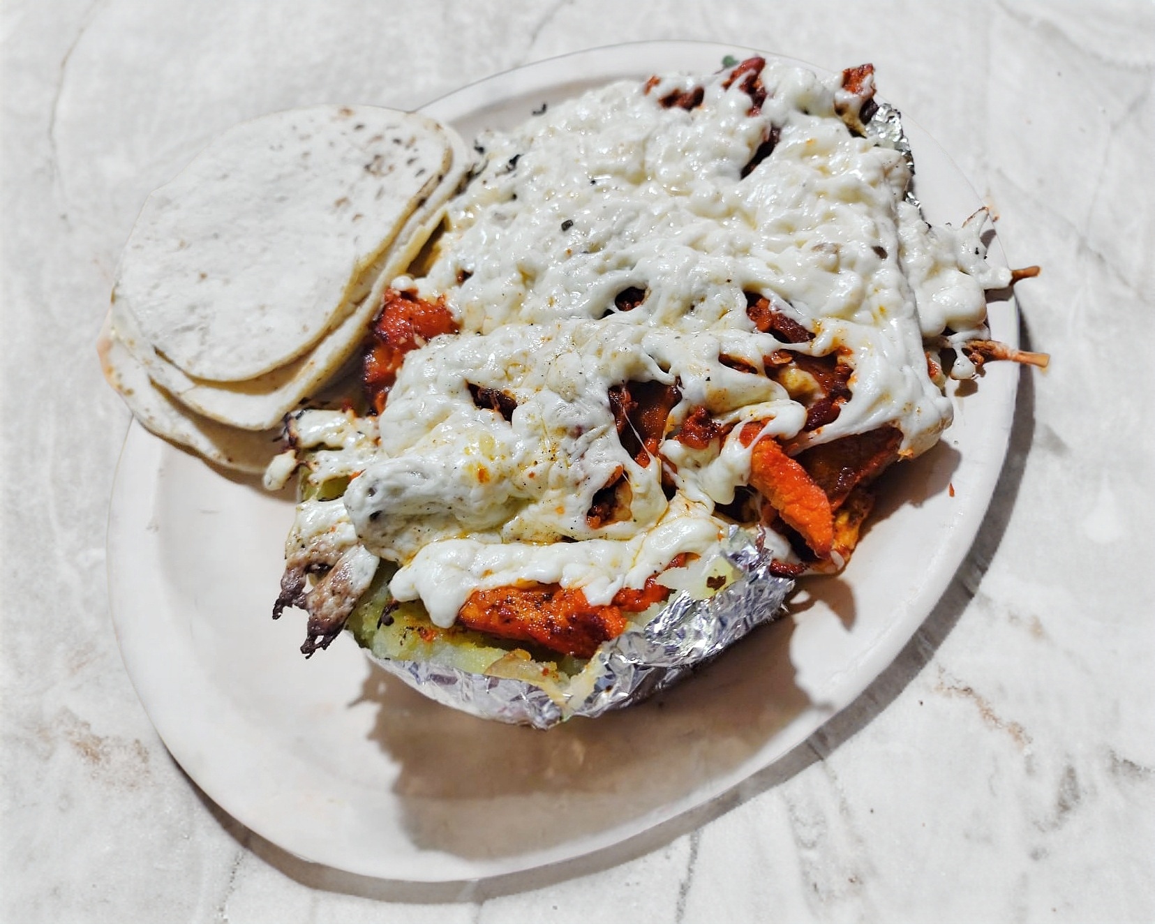 Bistec, chorizo, pastor, costilla, cebolla y queso fundido.