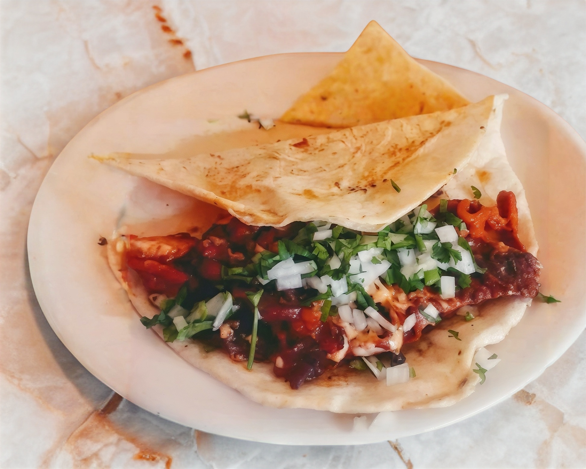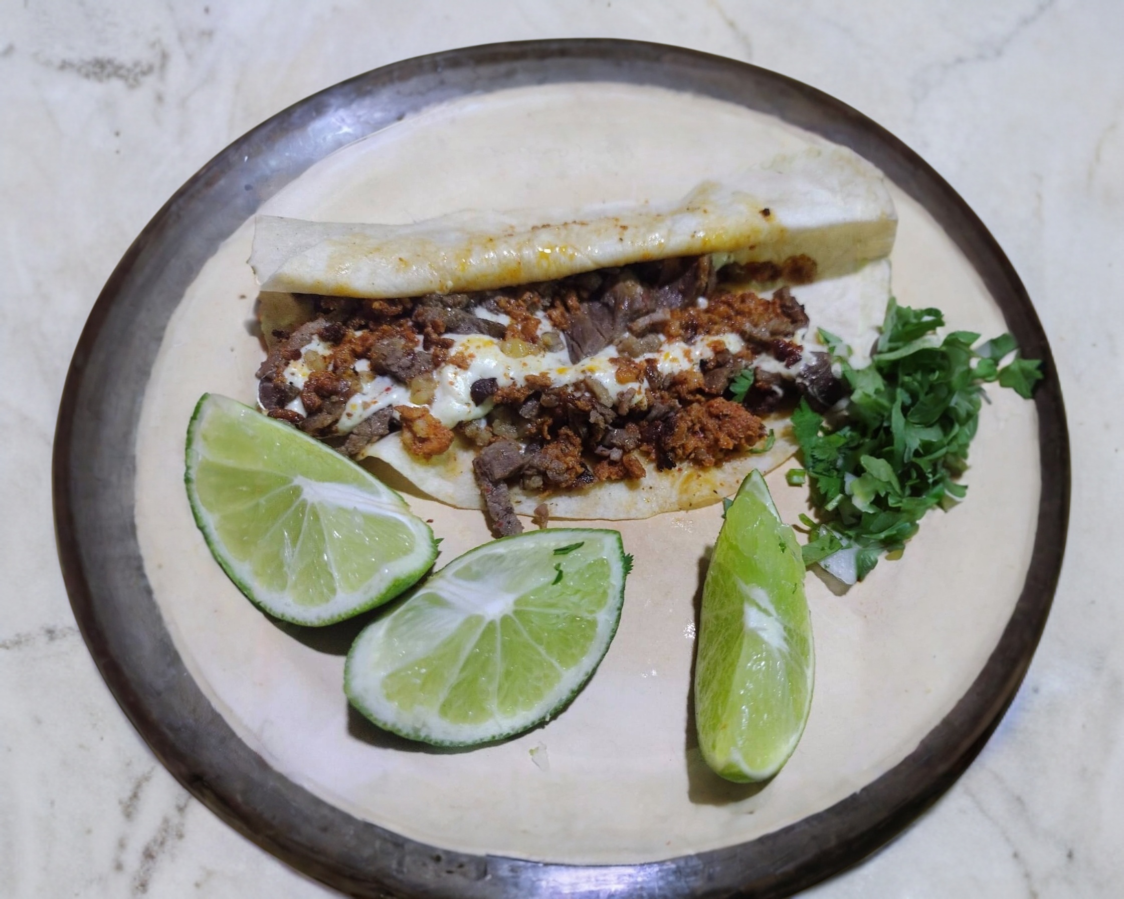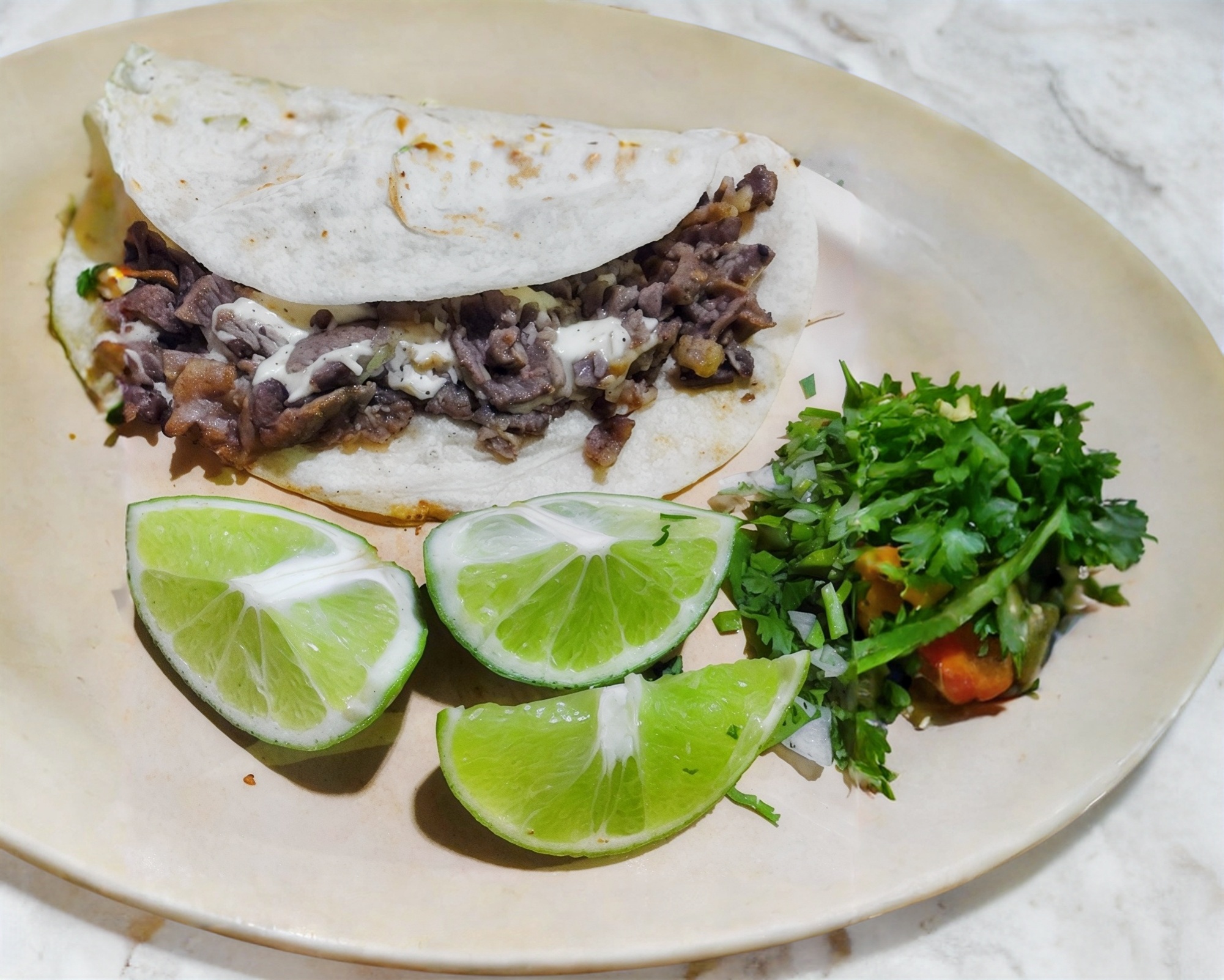 Doble tortilla de harina, bistec con chorizo y queso fundido.