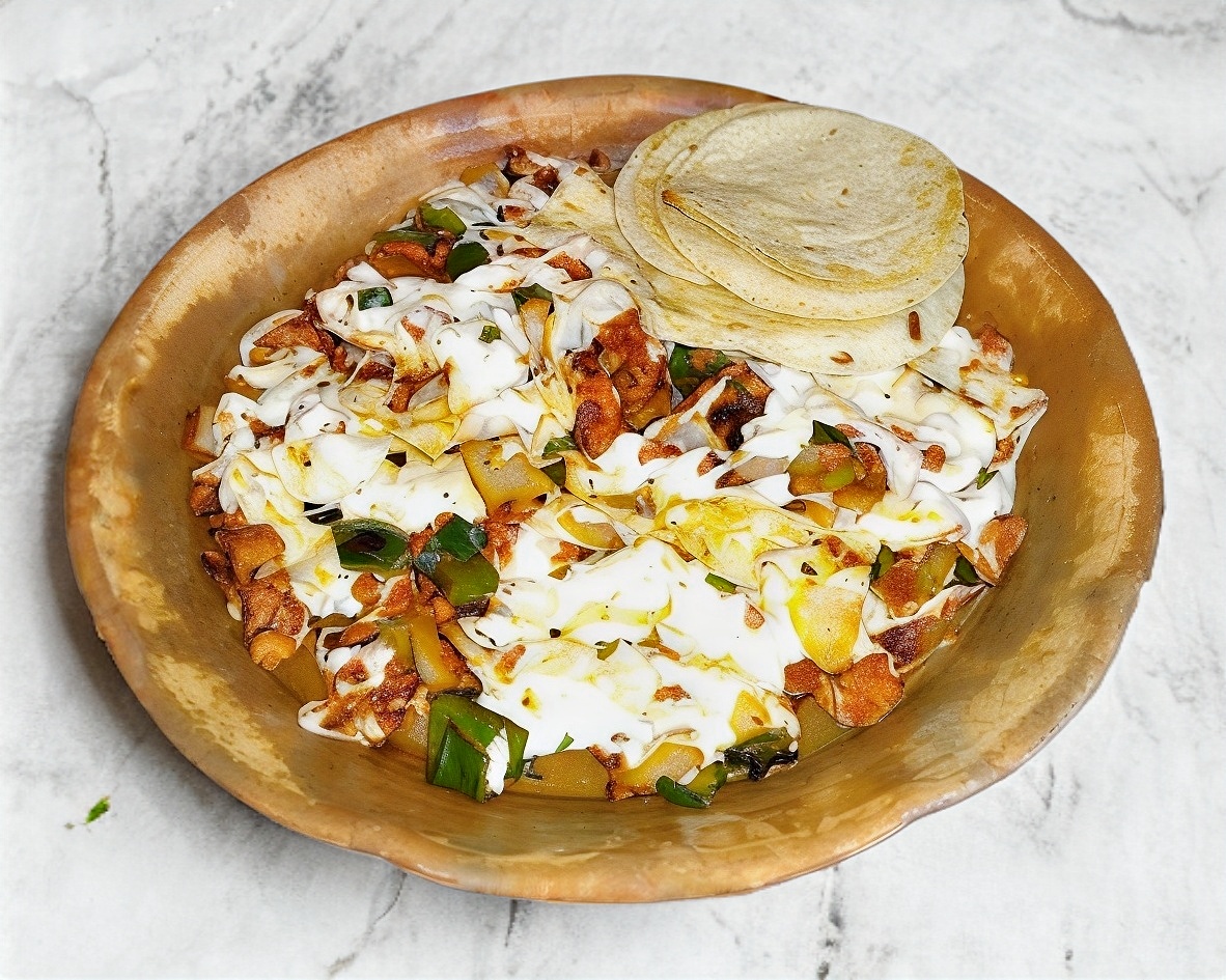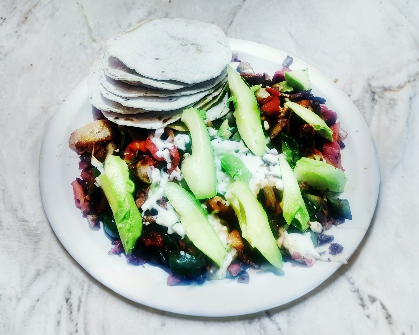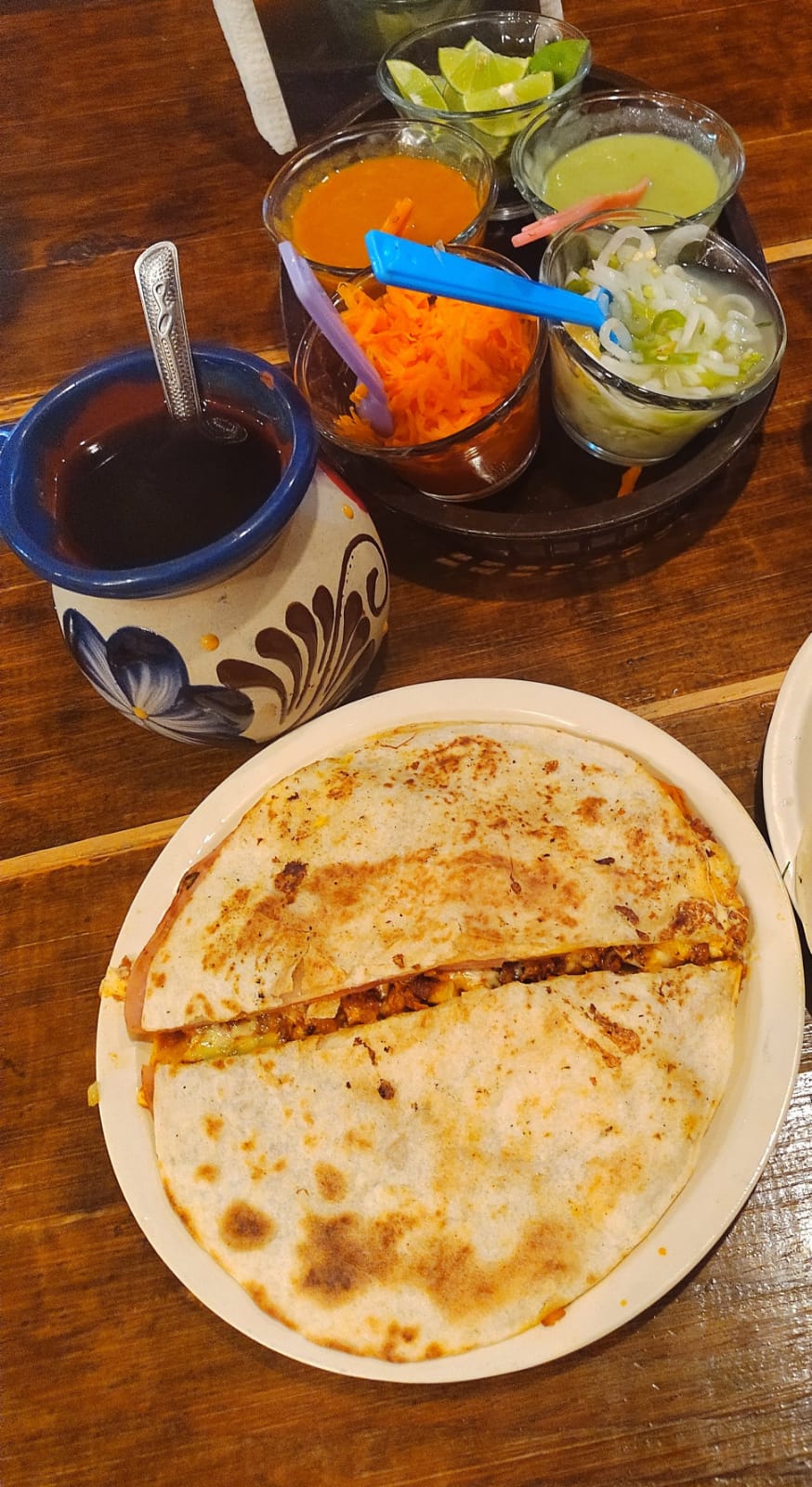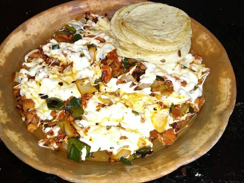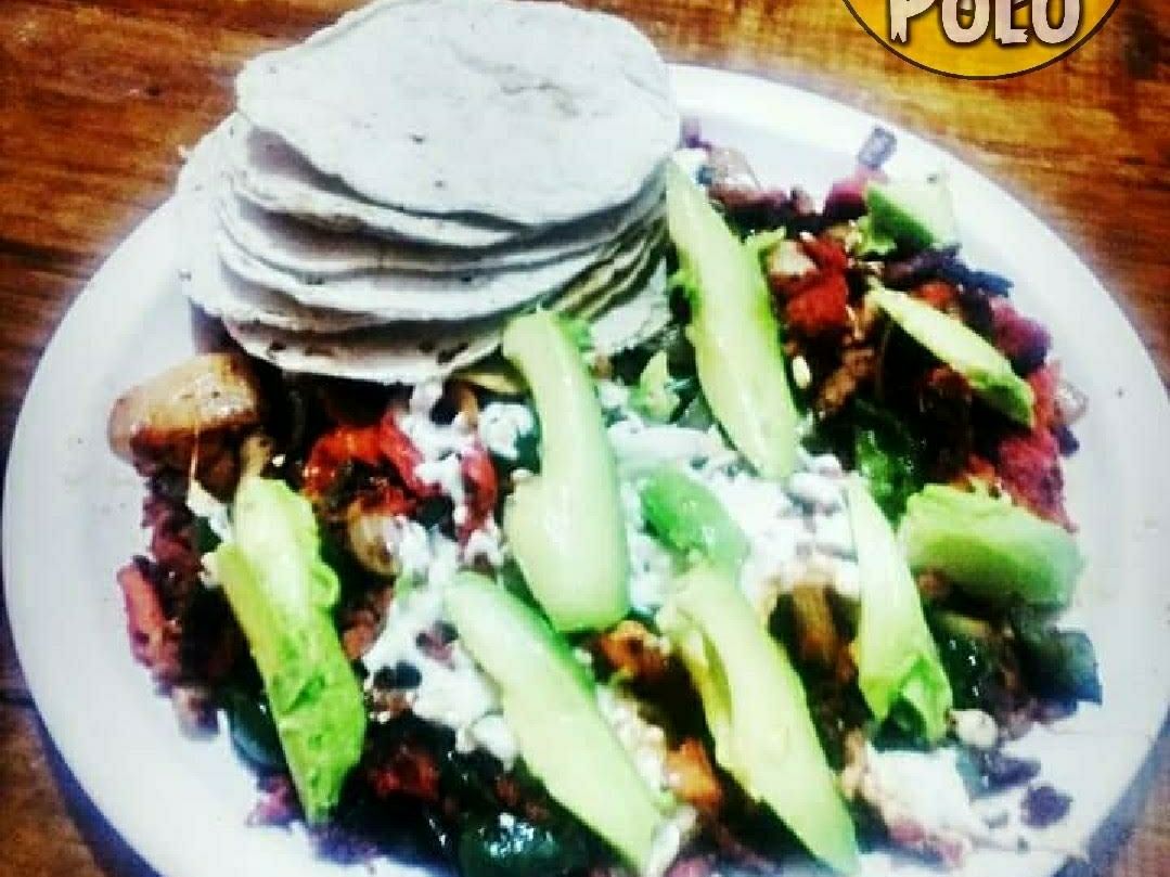 Acompañada con carne al pastor, guarnición de aguacate, jitomate, choriqueso, chile asado, nopales, cebollitas.