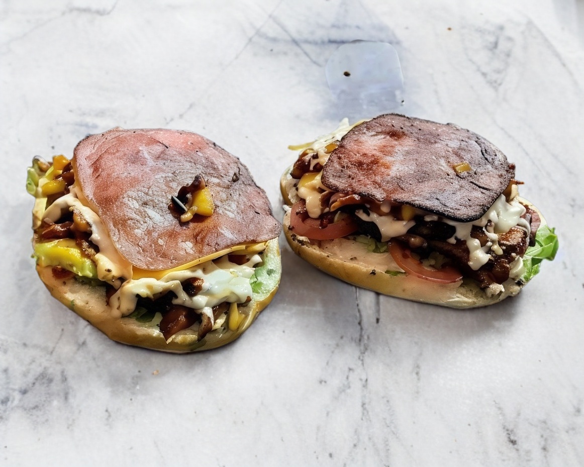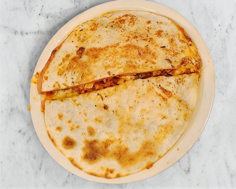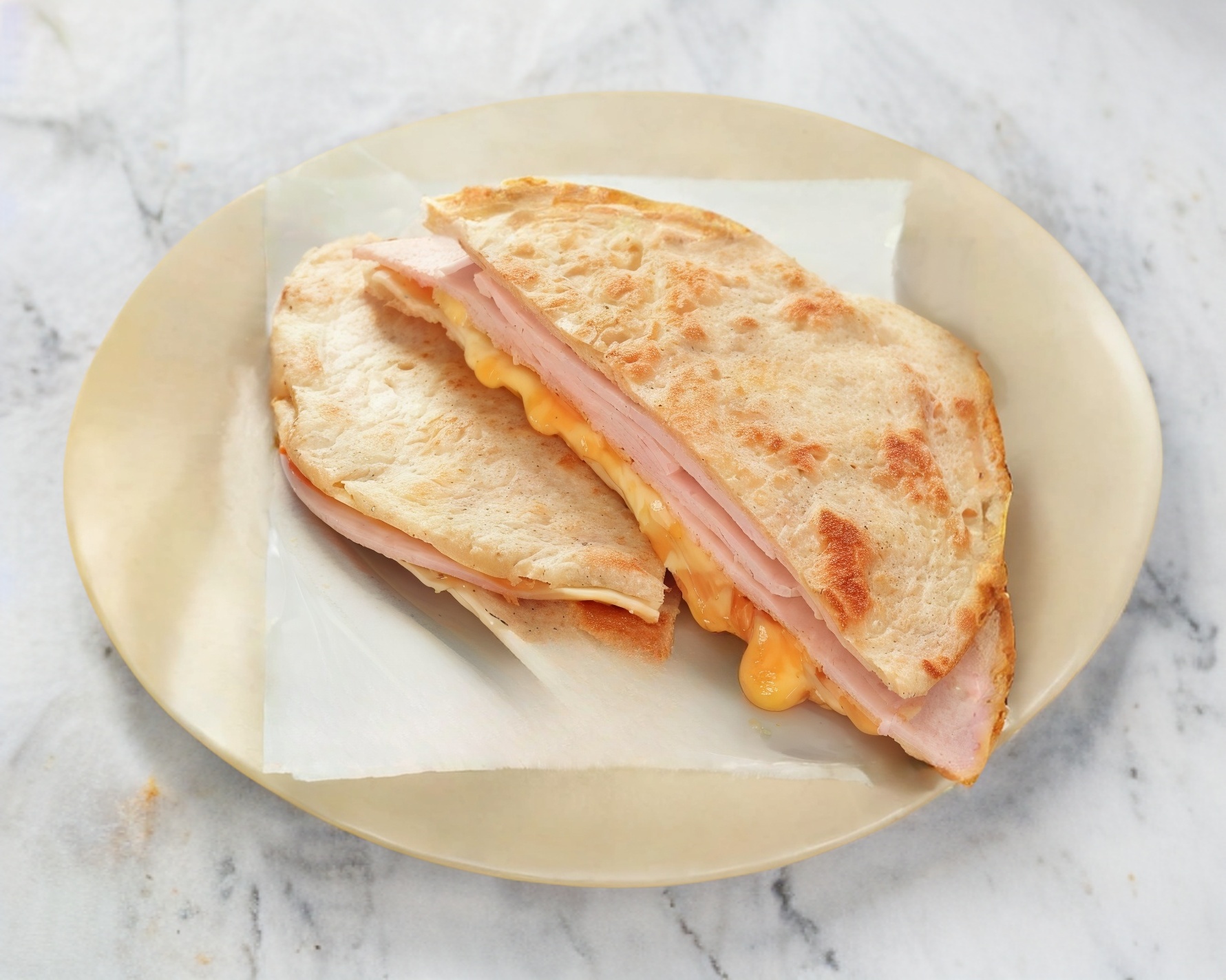 Doble tortilla de harina con queso fundido, jamón y queso amarillo.