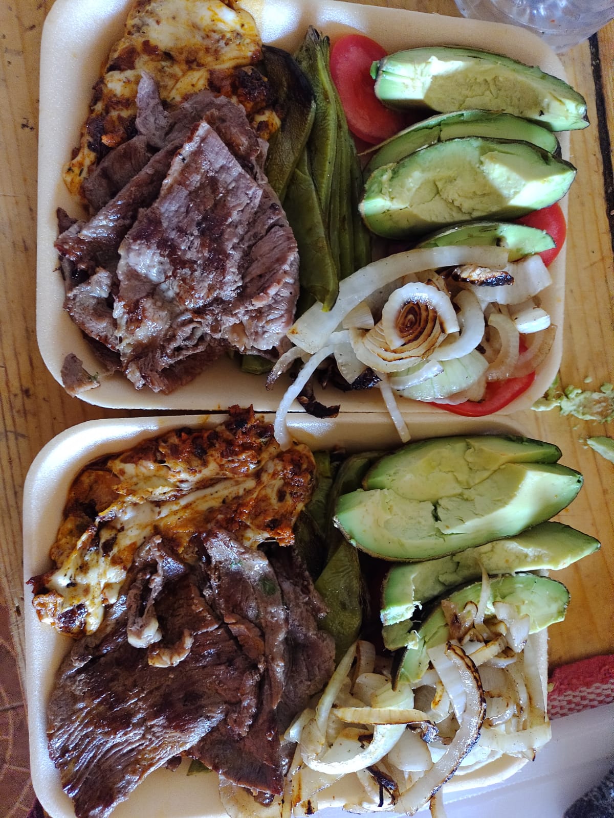 Acompañada de carne al postar, guarnición de aguacate, jitomate, choriqueso, chile asado, nopale ys cebollitas.