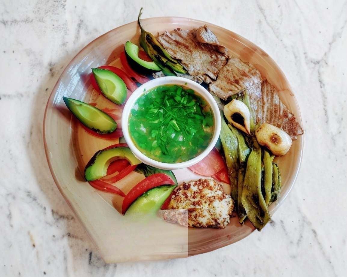 Acompañada de guarnición de aguacate, jitomate, choriqueso, chile asado, nopales, cebollitas y orden de consomé.