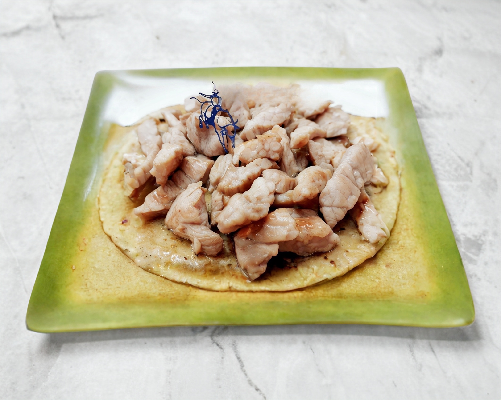 Tortilla de maíz, carne al pastor, cilantro y cebolla.