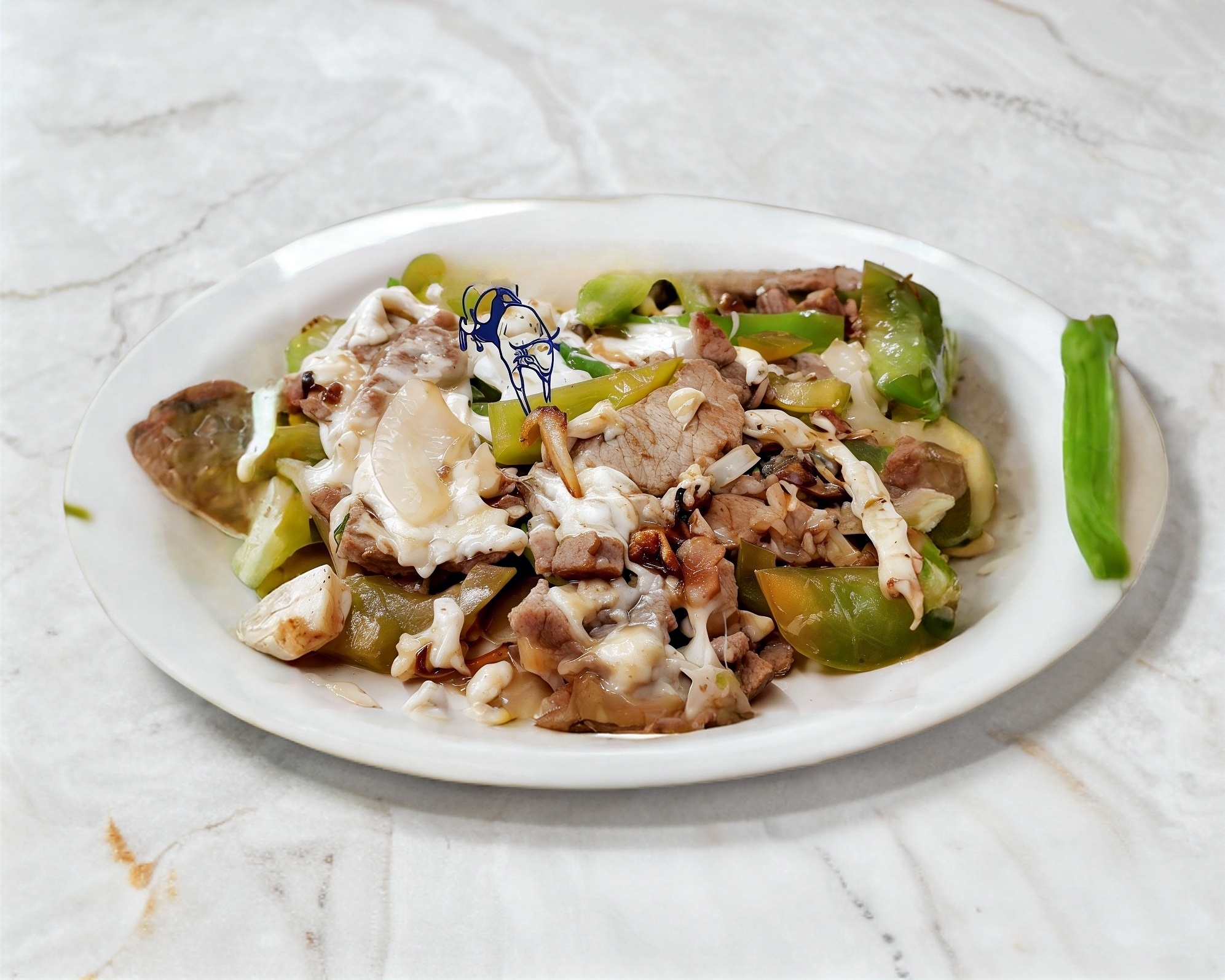 Pimiento, cebolla, bistec, quesillo. Acompañado de tortillas.