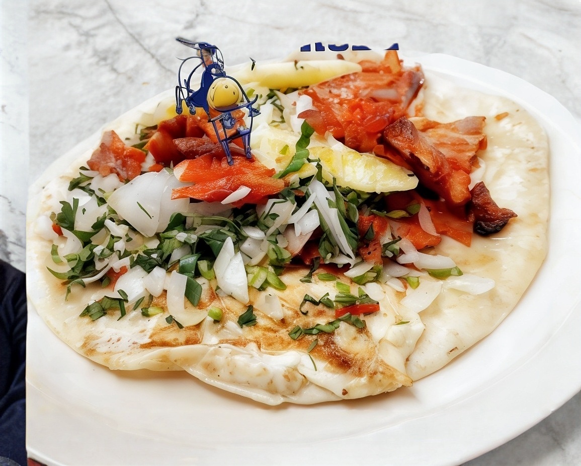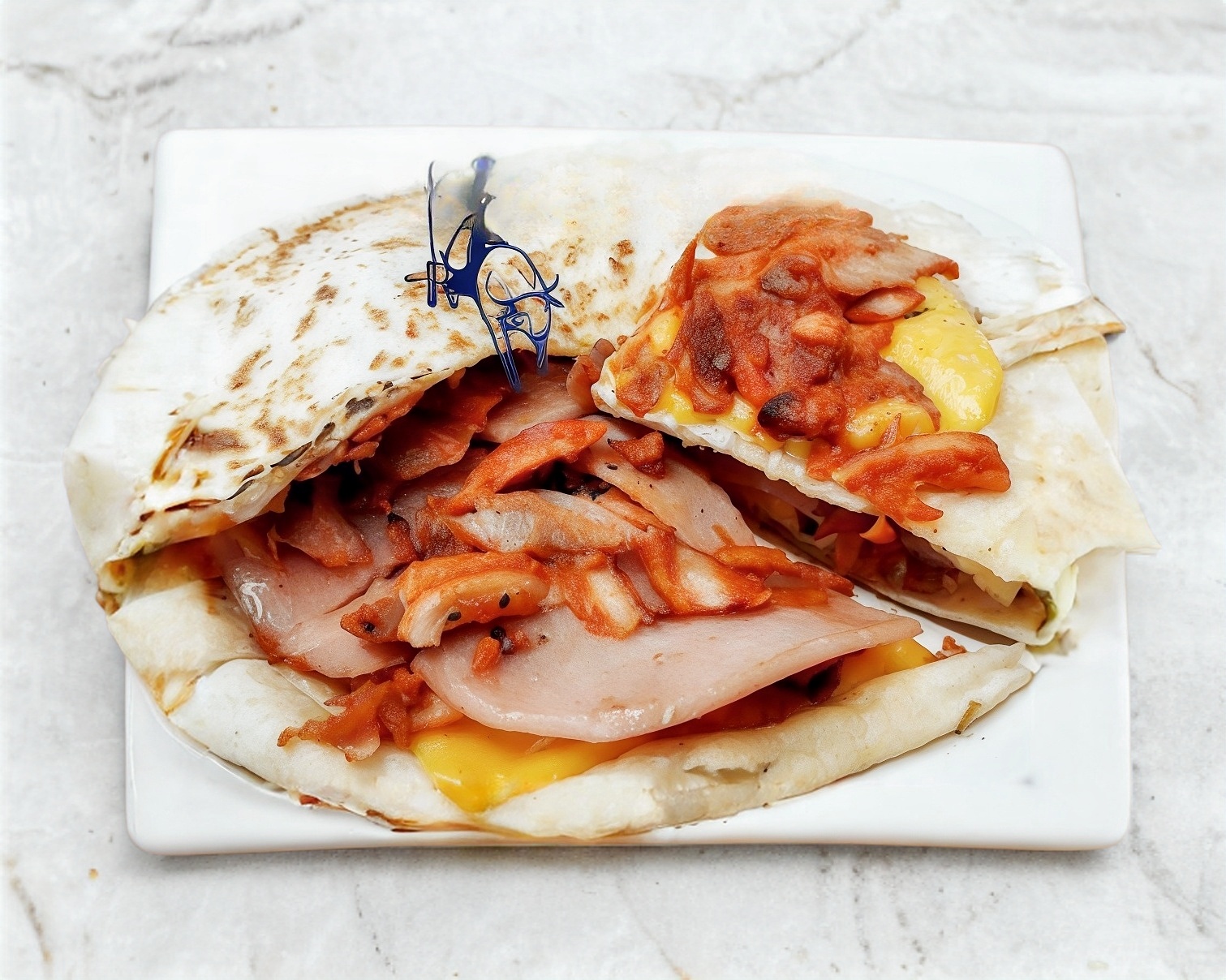2 tortillas de harina, quesillo, jamón, queso amarillo y carne al pastor.