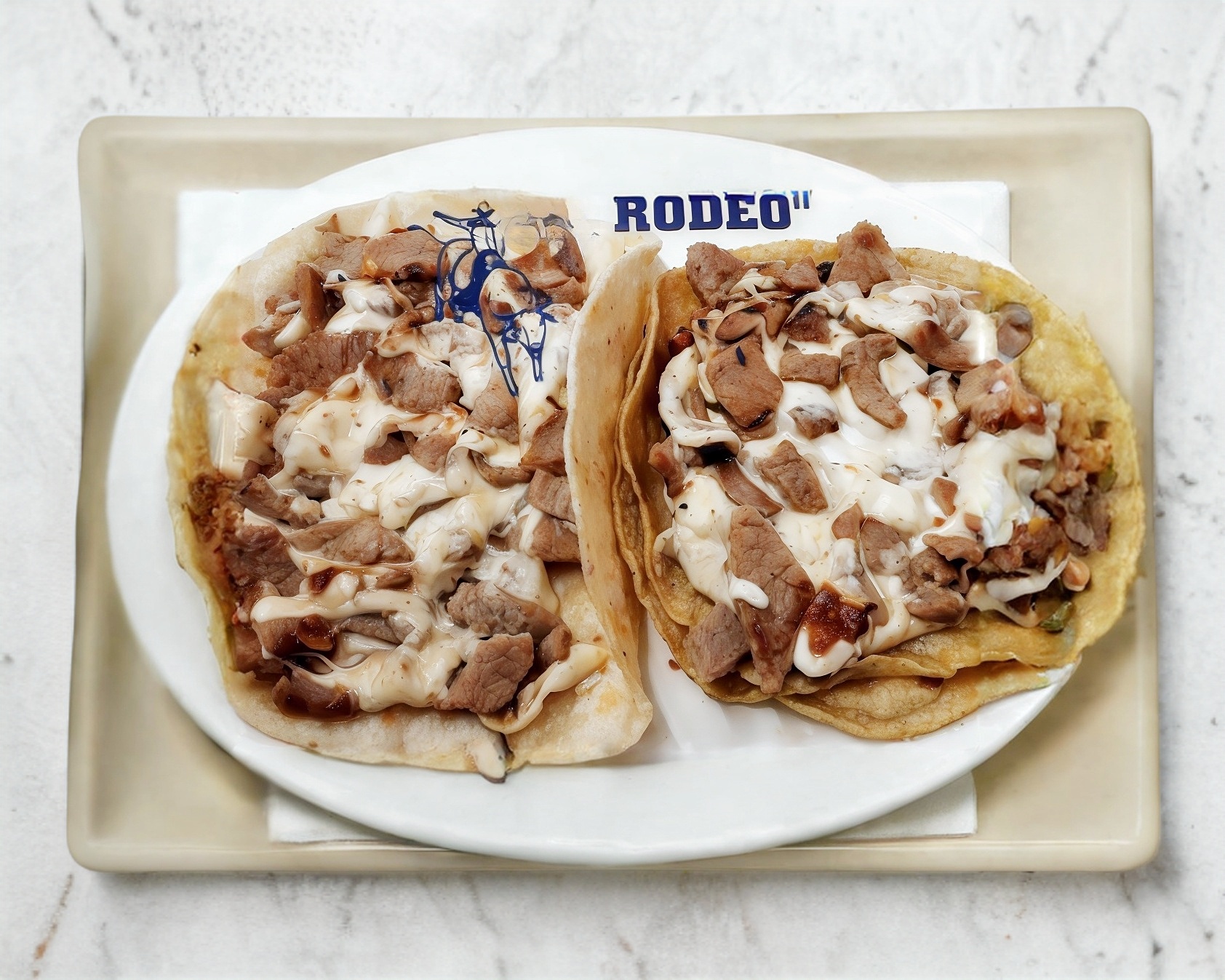 1 tortilla de maíz, quesillo, carne al pastor, cilantro y cebolla.