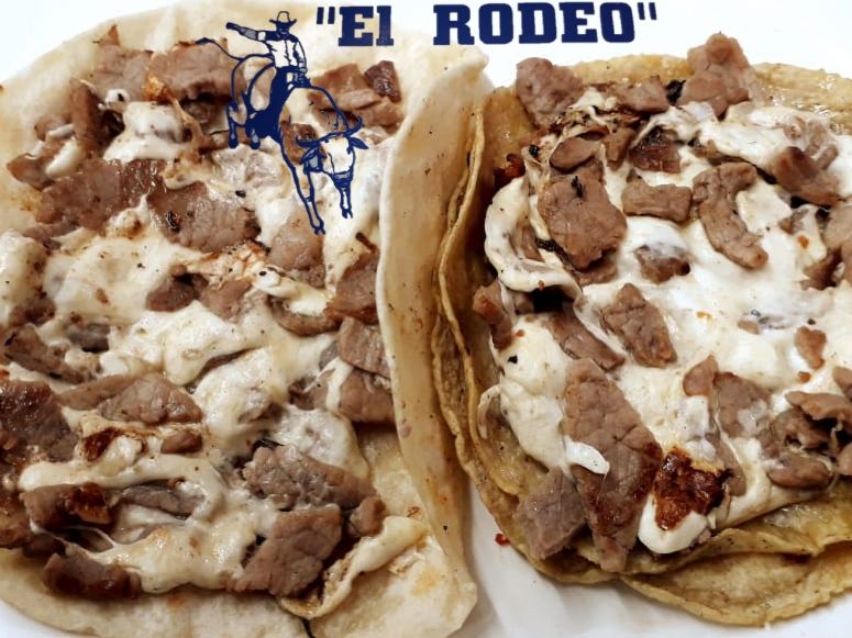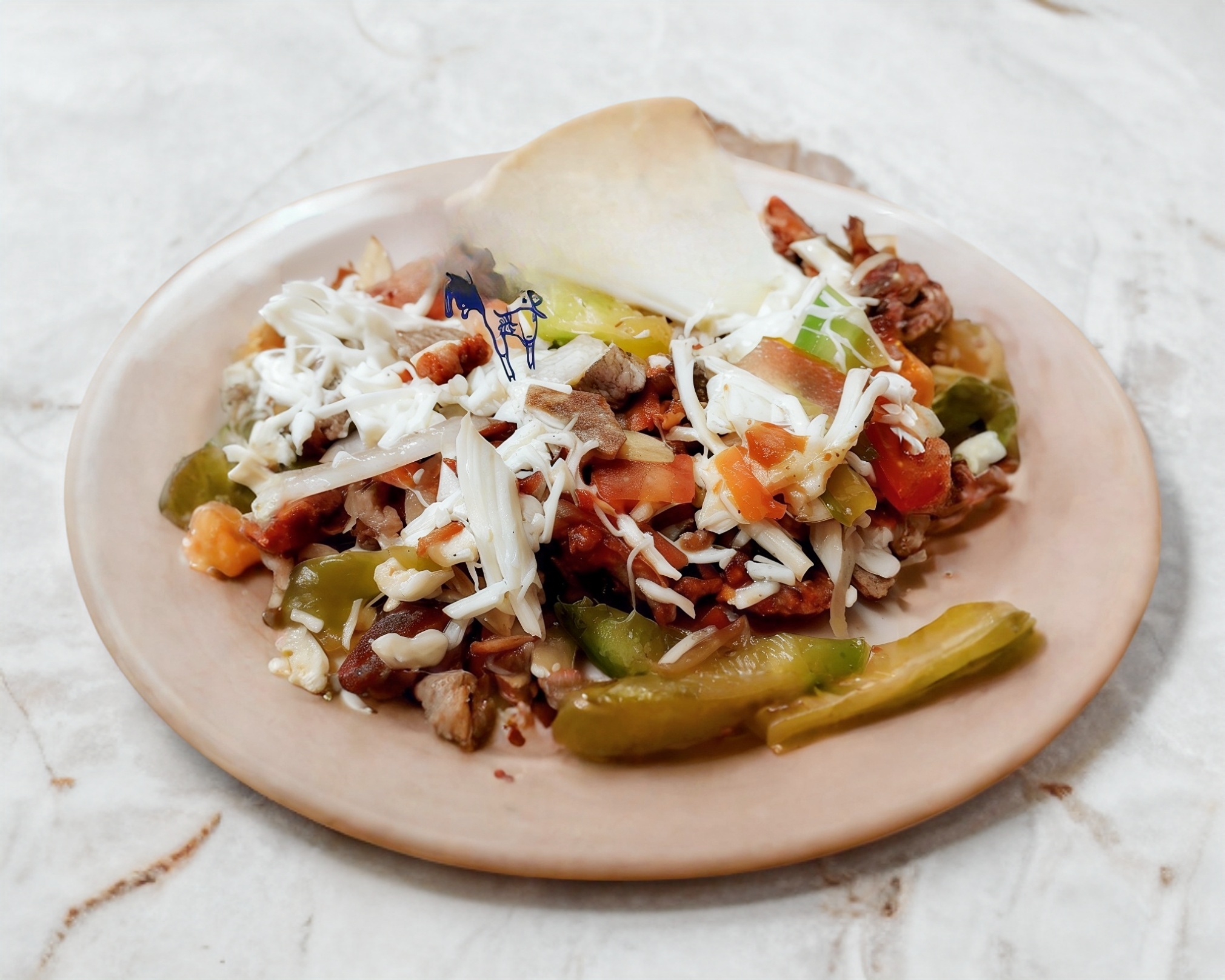 Pimiento, cebolla, tomate, pastor, bistec, quesillo. Acompañado de tortillas.