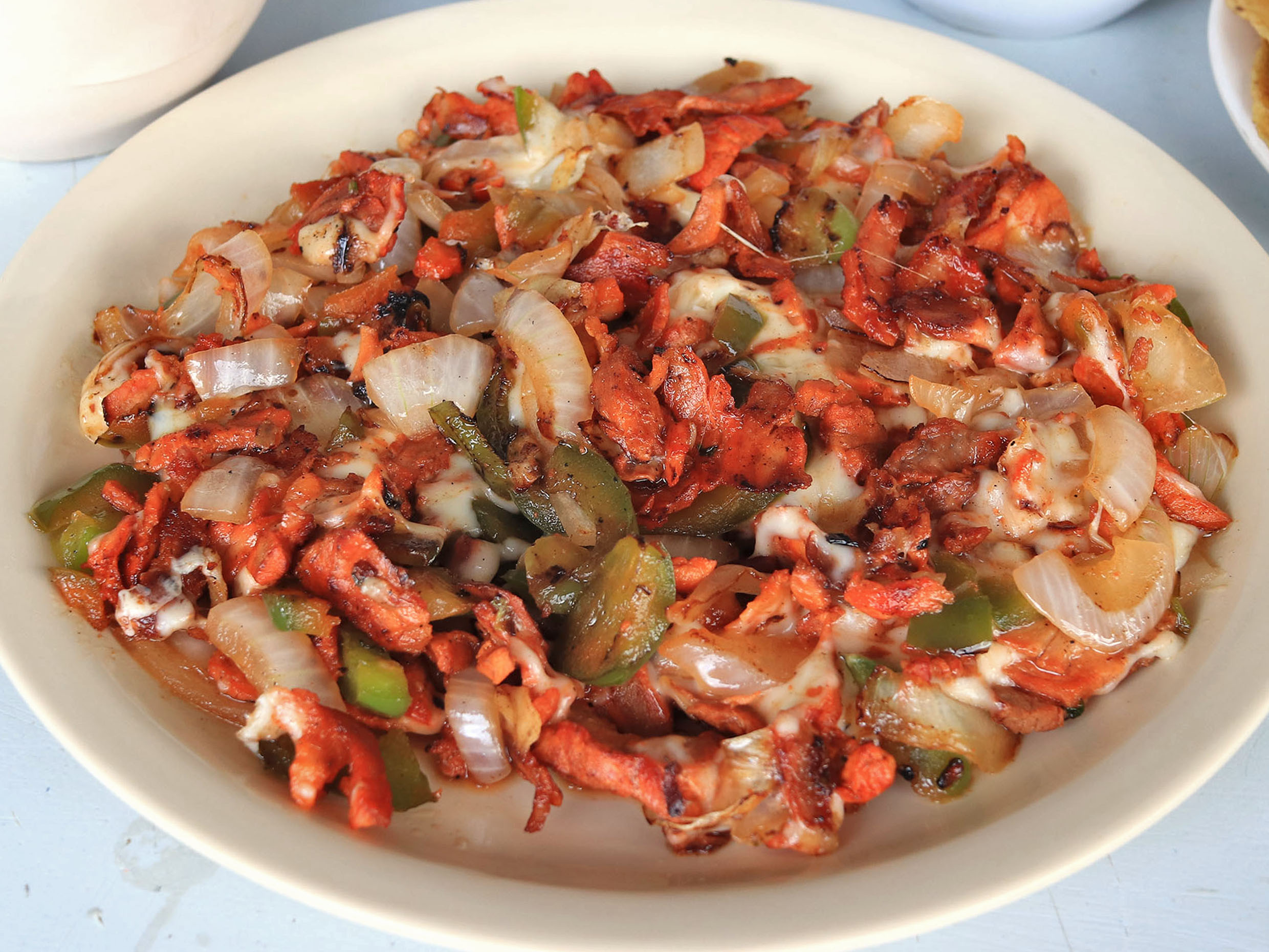 Pimiento, cebolla, pastor y quesillo, acompañado de tortillas.
