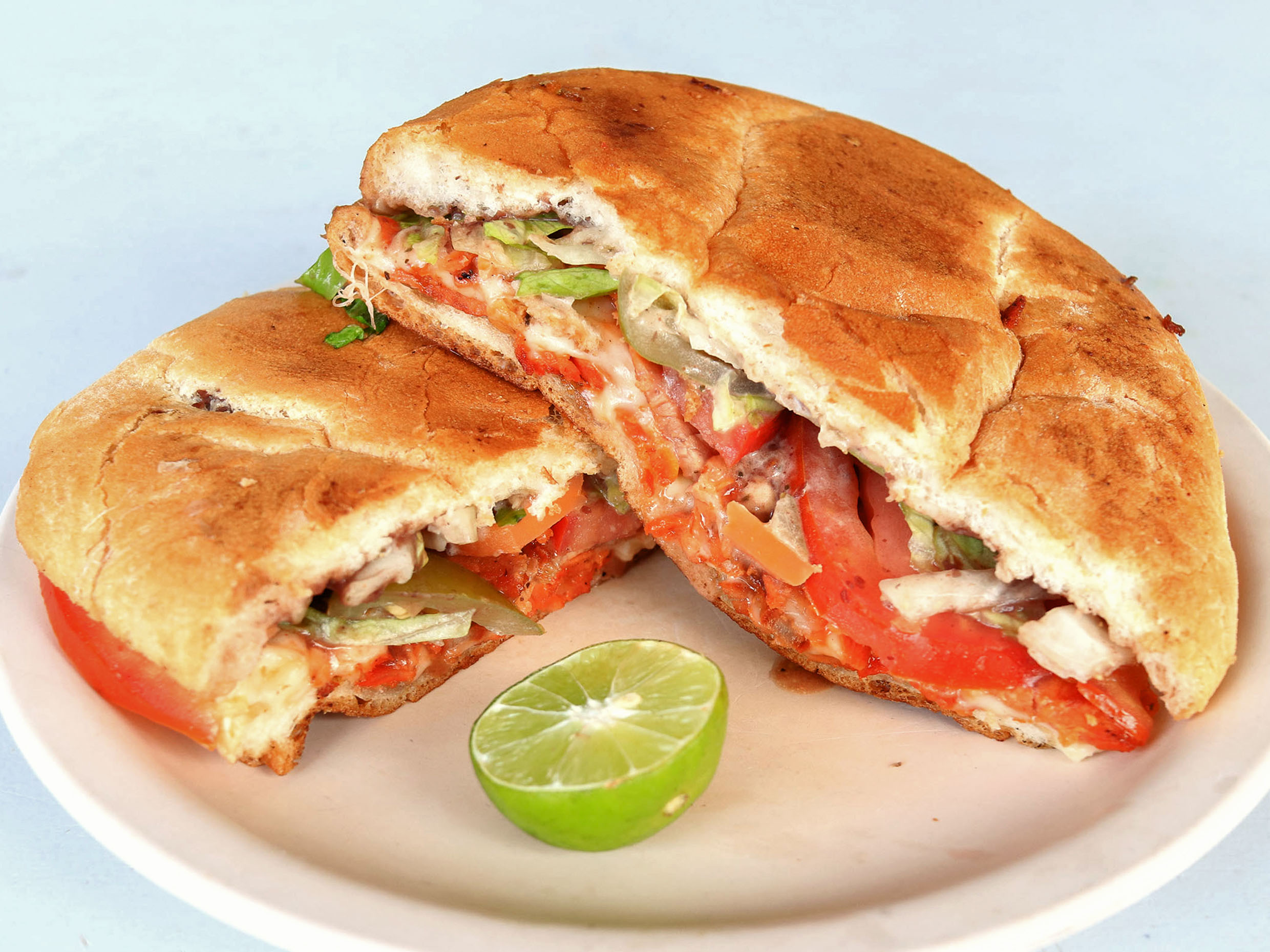 Telera, mayonesa, frijol, lechuga, aguacate, tomate, chile en vinagre, quesillo y carne al pastor
