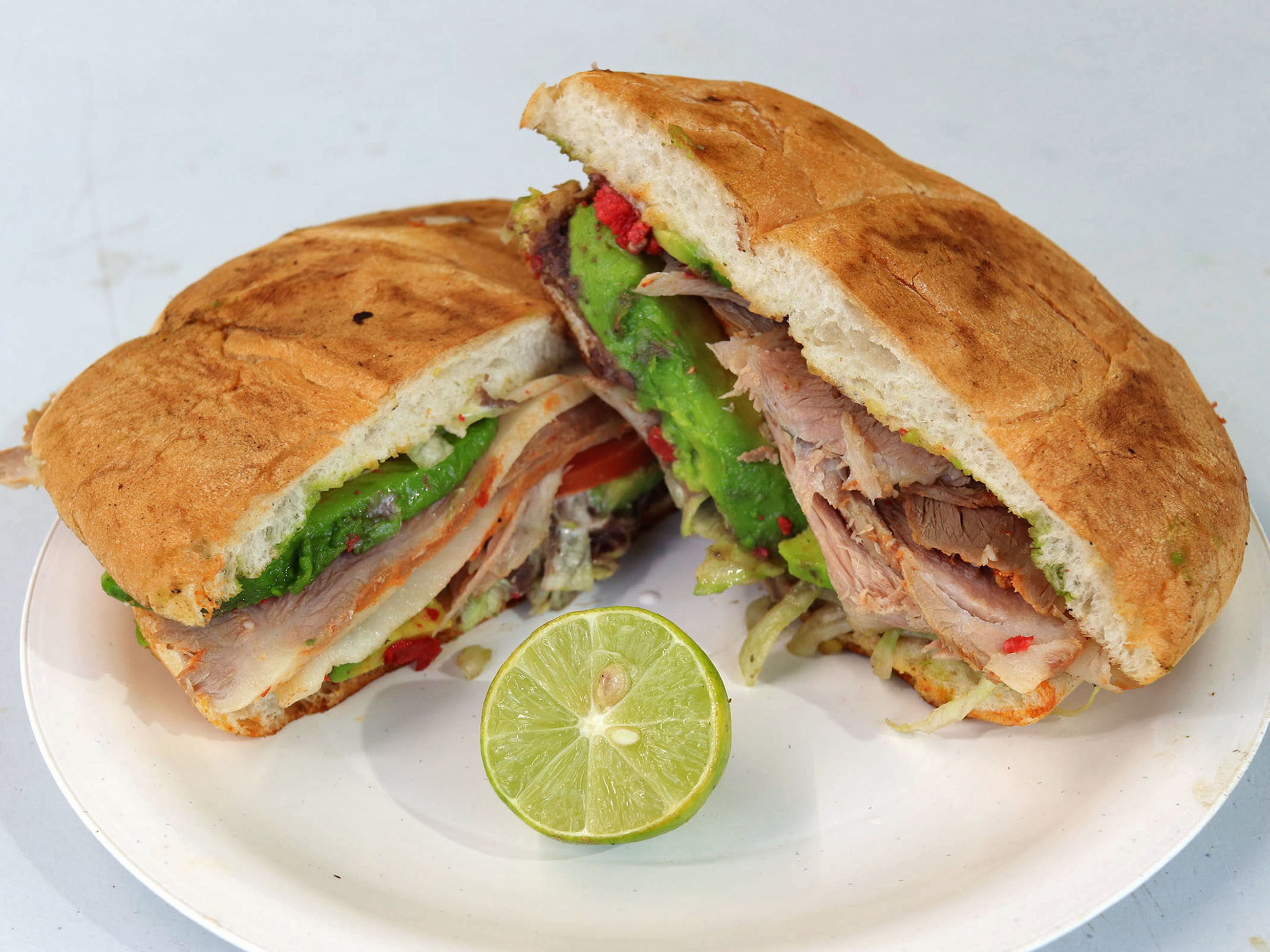 Telera, mayonesa, frijol, lechuga, aguacate, tomate, chile en vinagre y pierna de puerco
