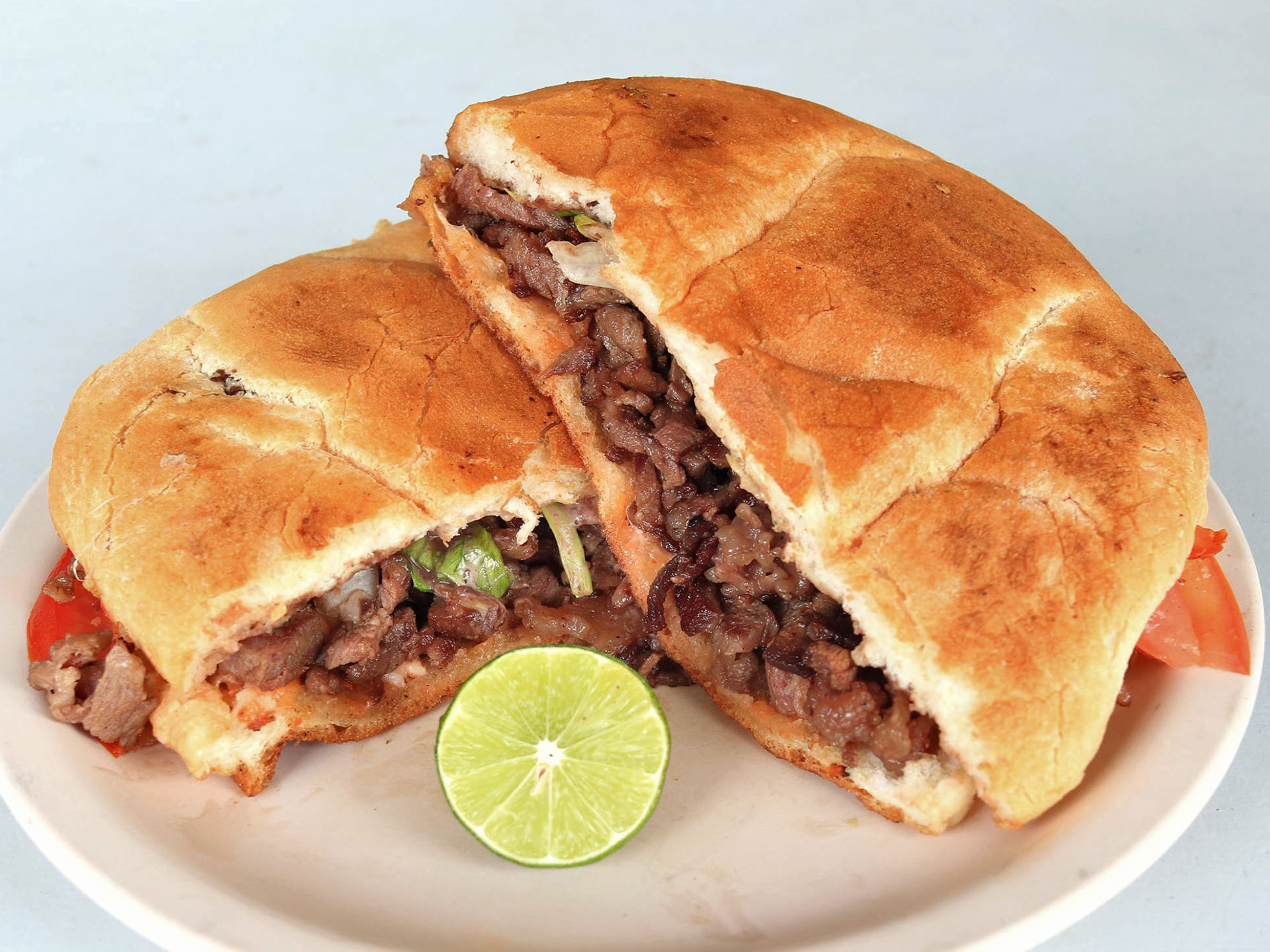 Telera, mayonesa, frijol, lechuga, aguacate, tomate, chile en vinagre y carne de bistec