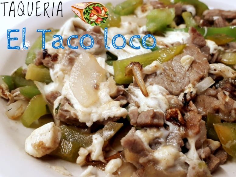 Pimiento, cebolla, bistec y quesillo, acompañado de tortillas.