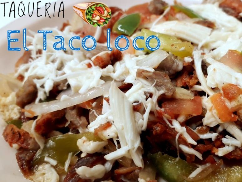 Cebolla, pimiento, tomate, pastor, bistec y quesillo, acompañado de tortillas.