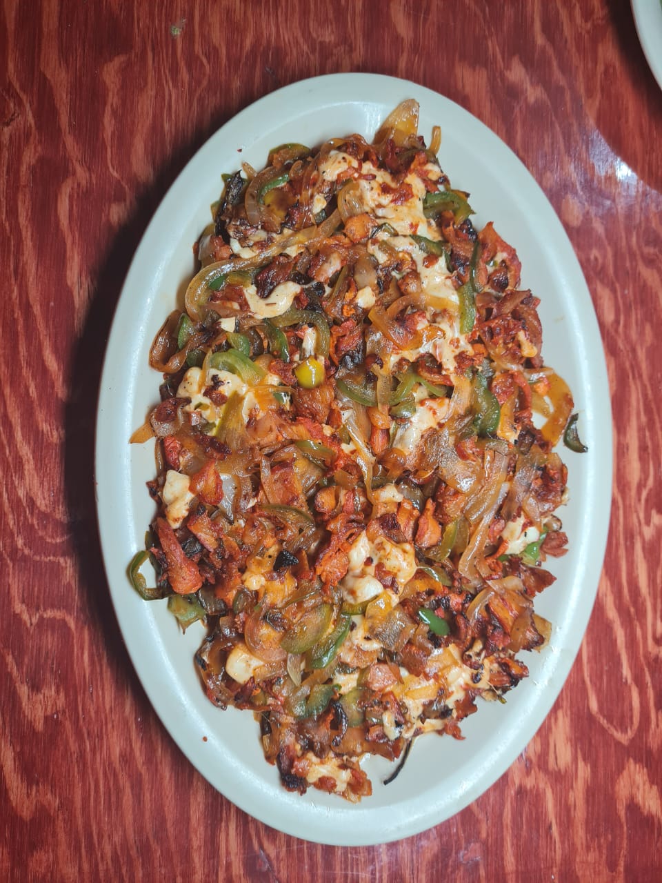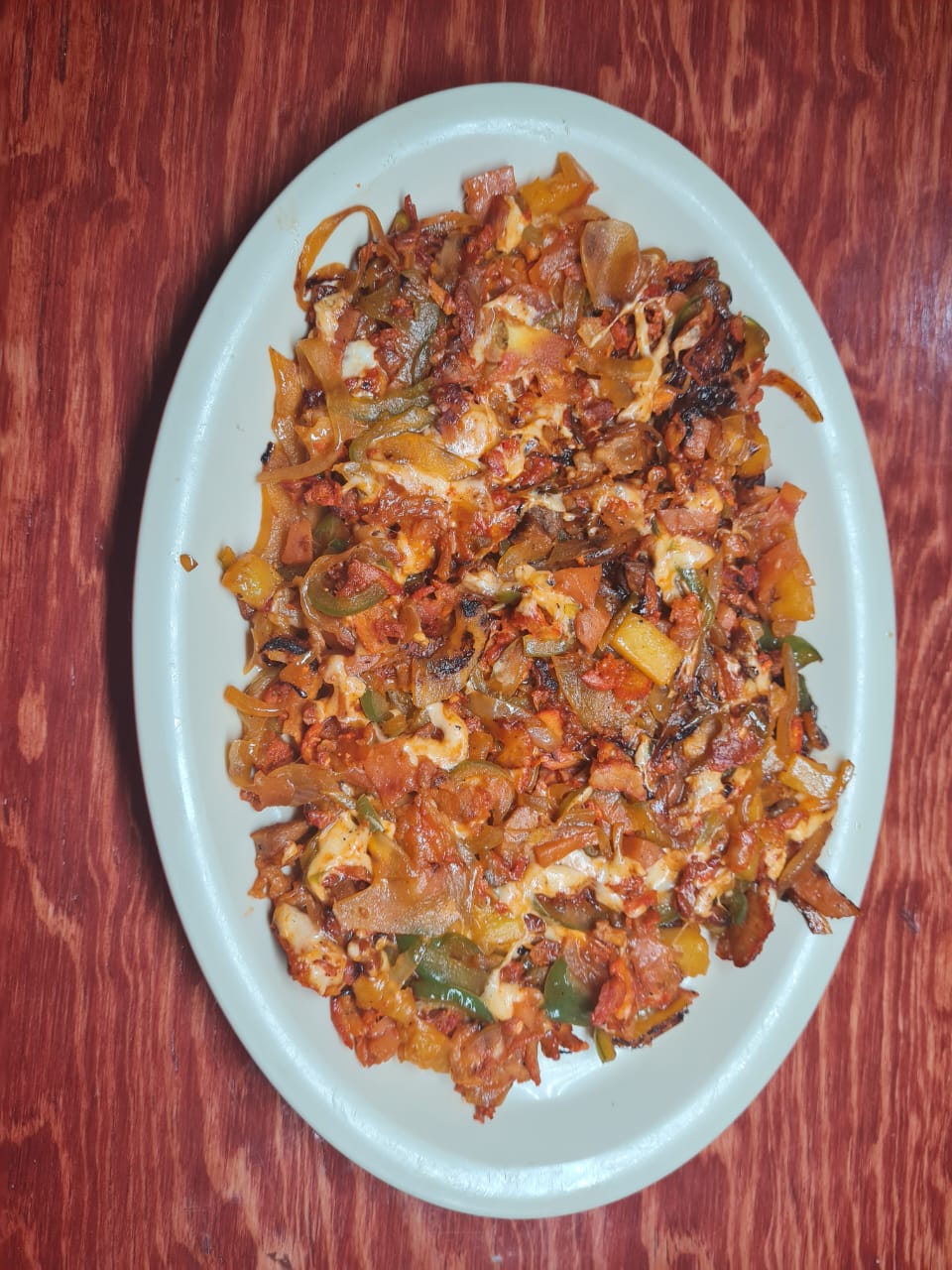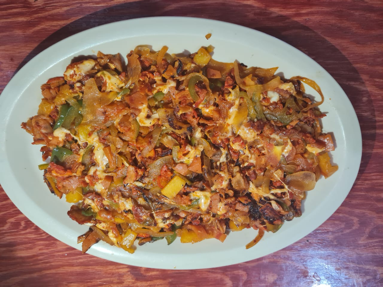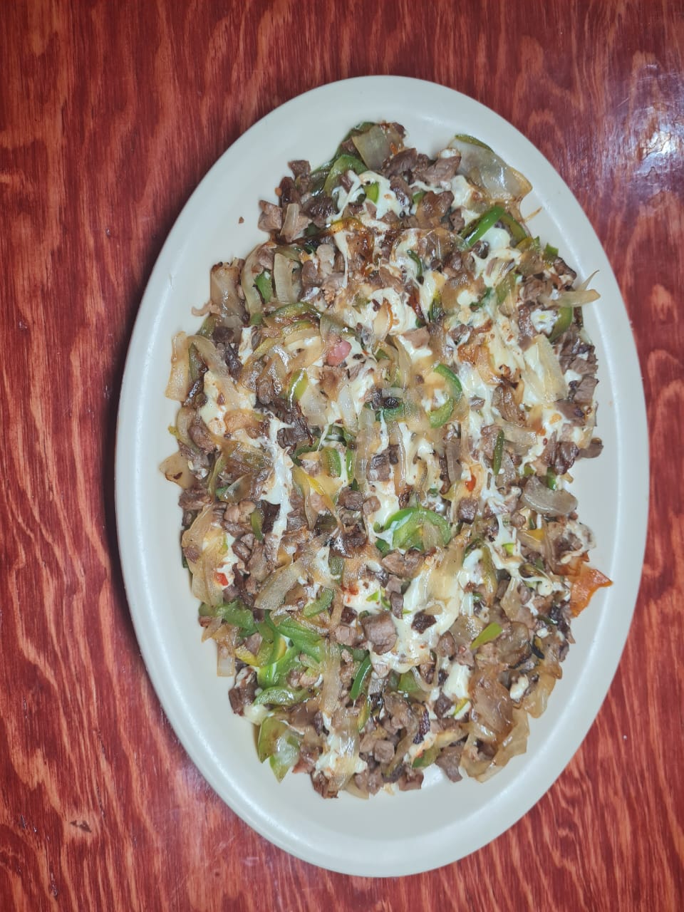 Bistec al pastor, tocino, cebolla, morrón, tomate y quesillo.