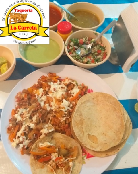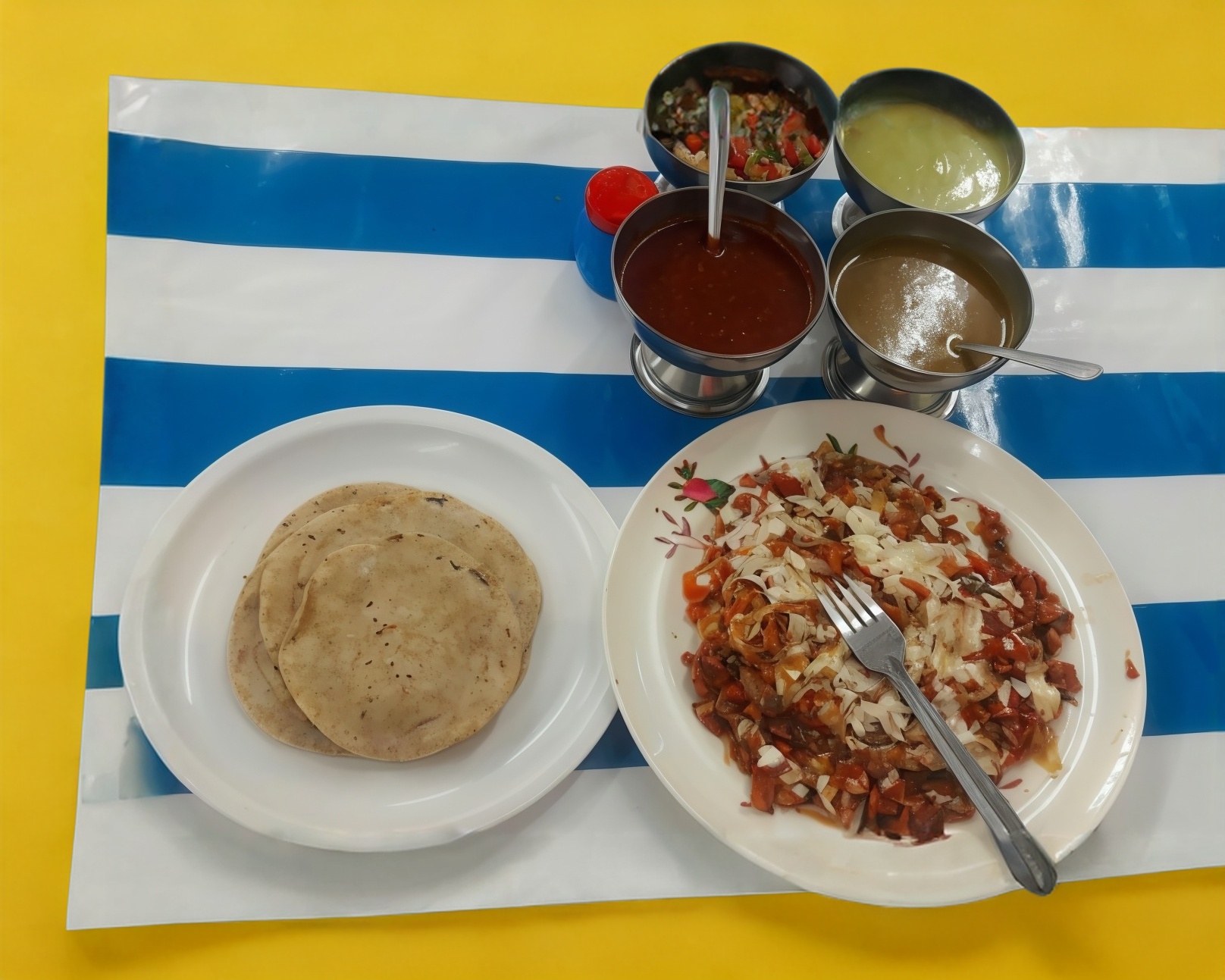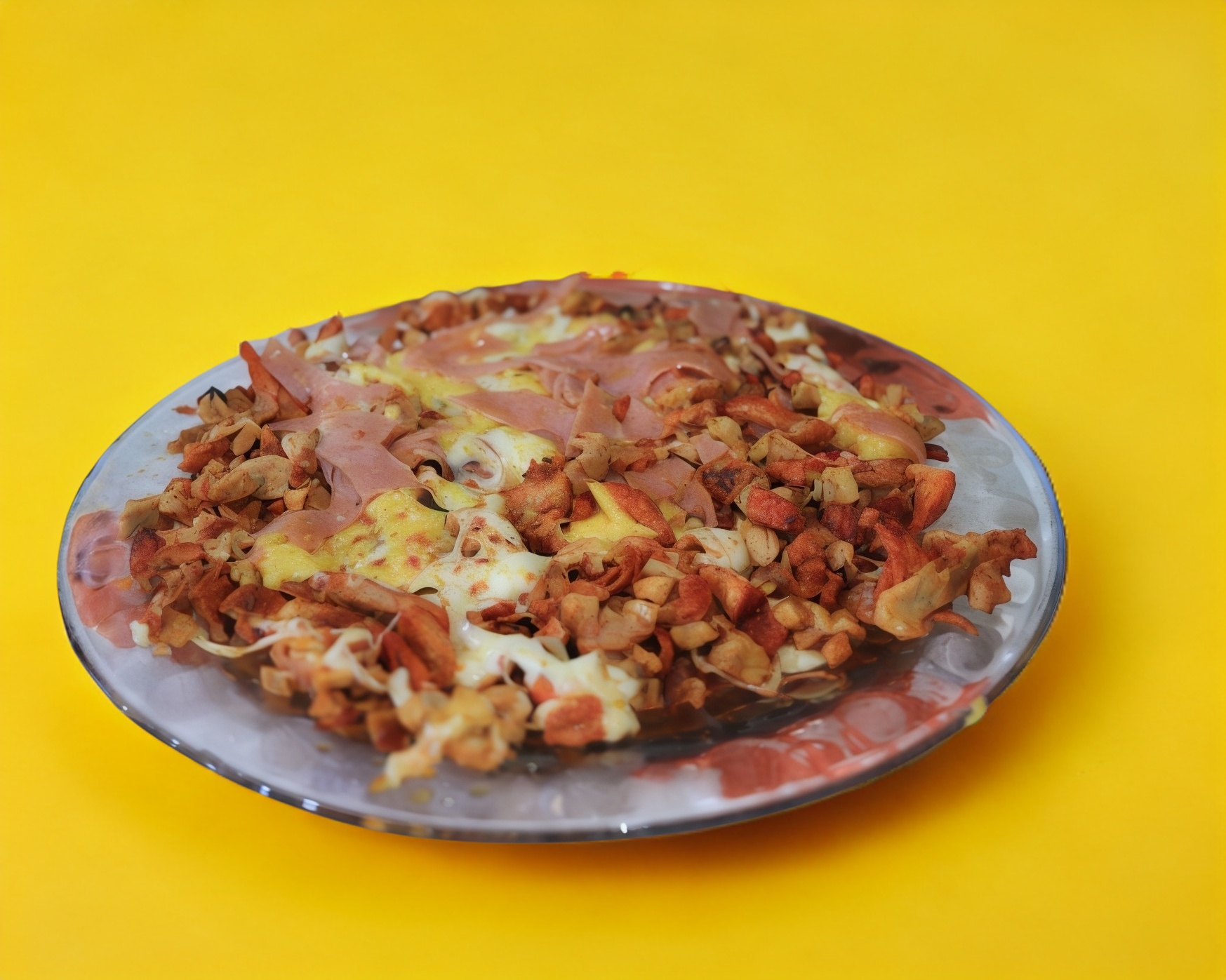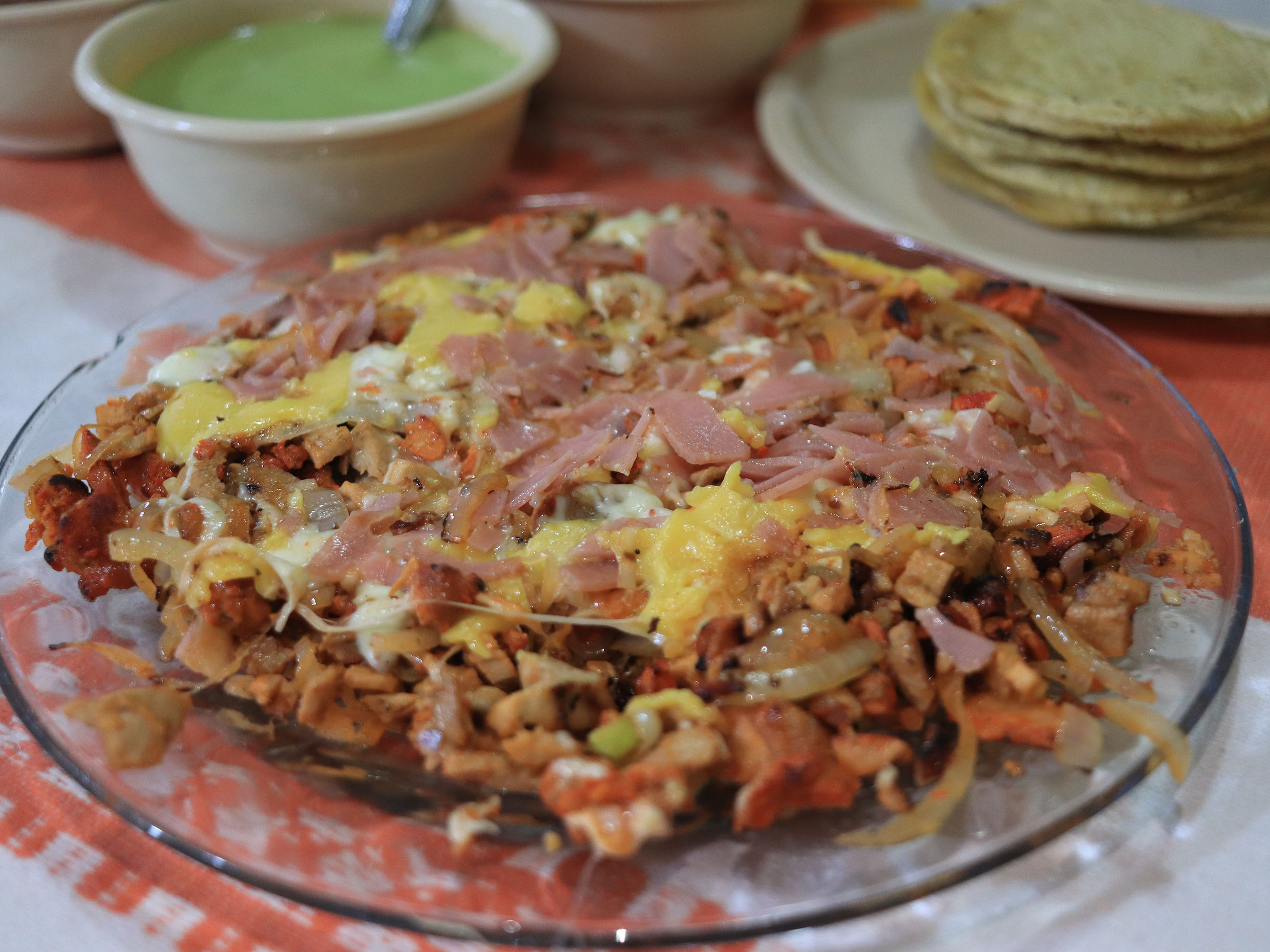 Salsa mexicana con pastor, quesillo, jamón y tocino.