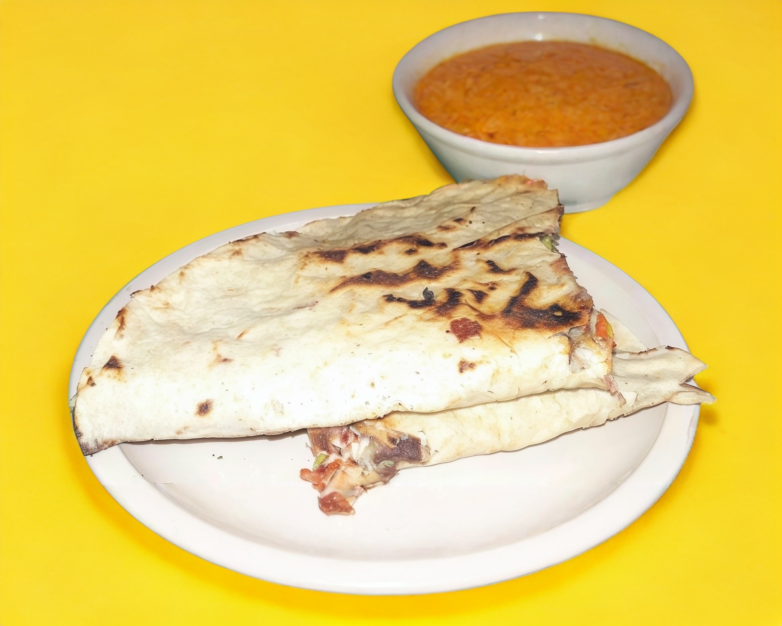 Pimiento morrón, cebolla, quesillo, bistec y tocino.
