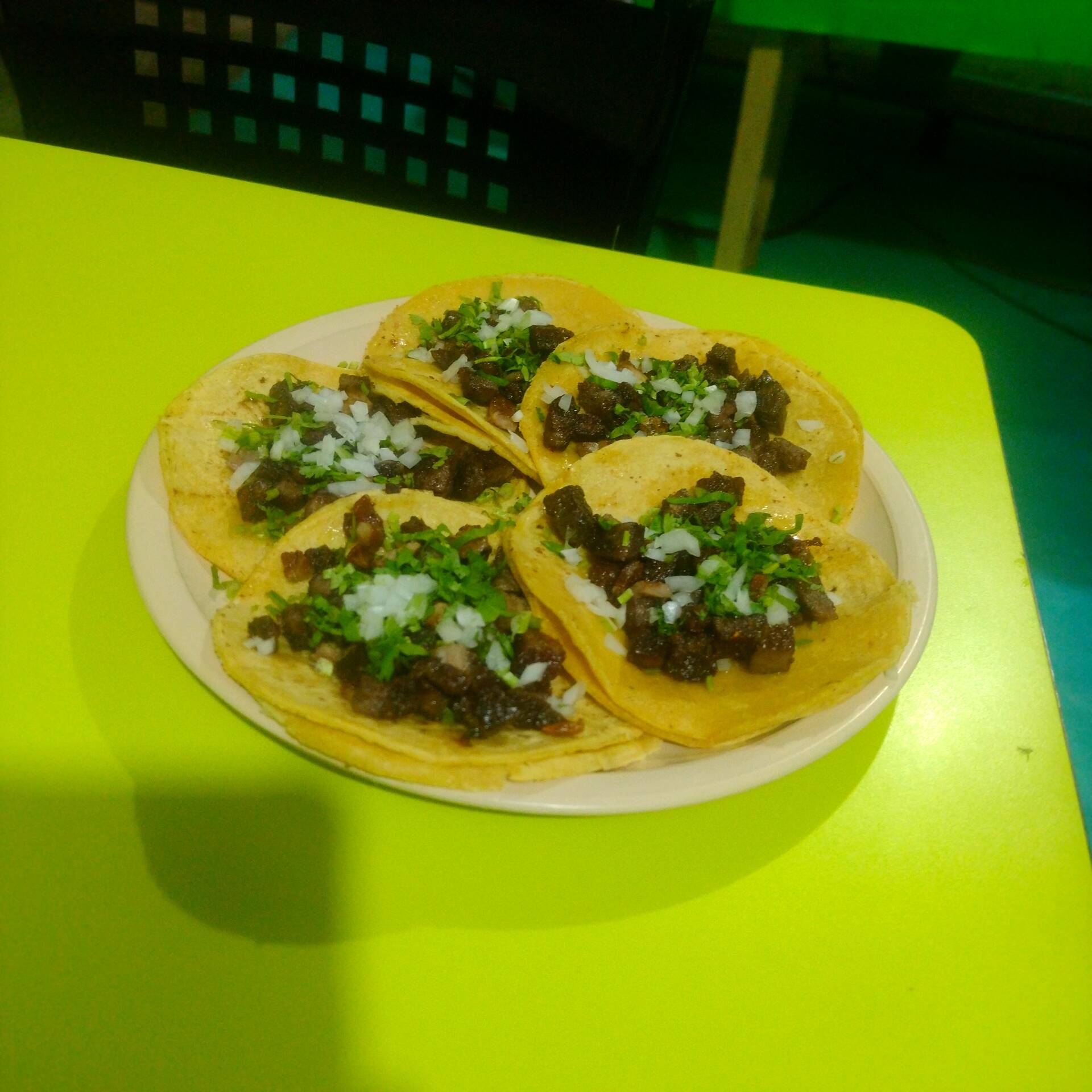 5 tacos de suadero con cebolla y cilantro