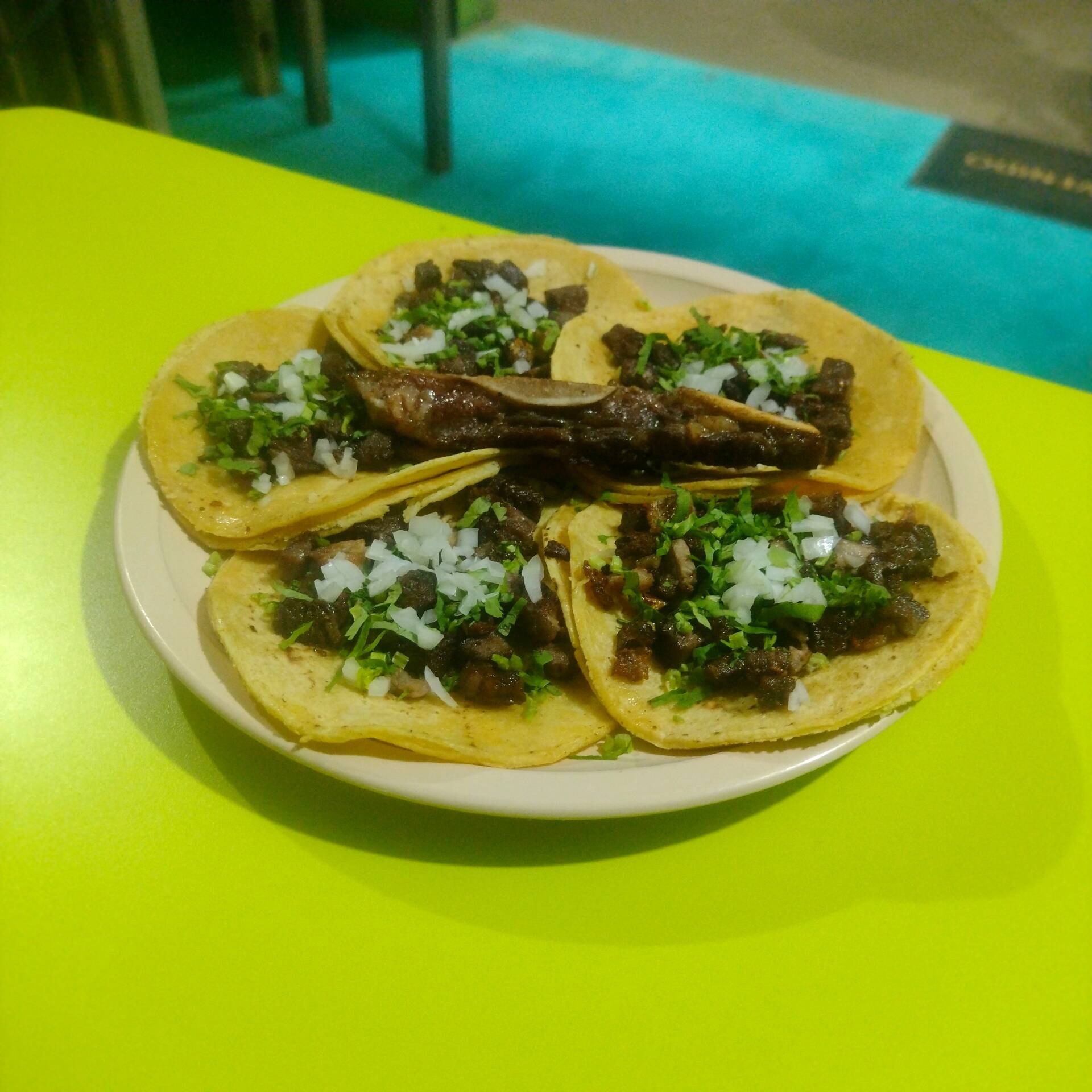 5 tacos de costilla con cebolla y cilantro