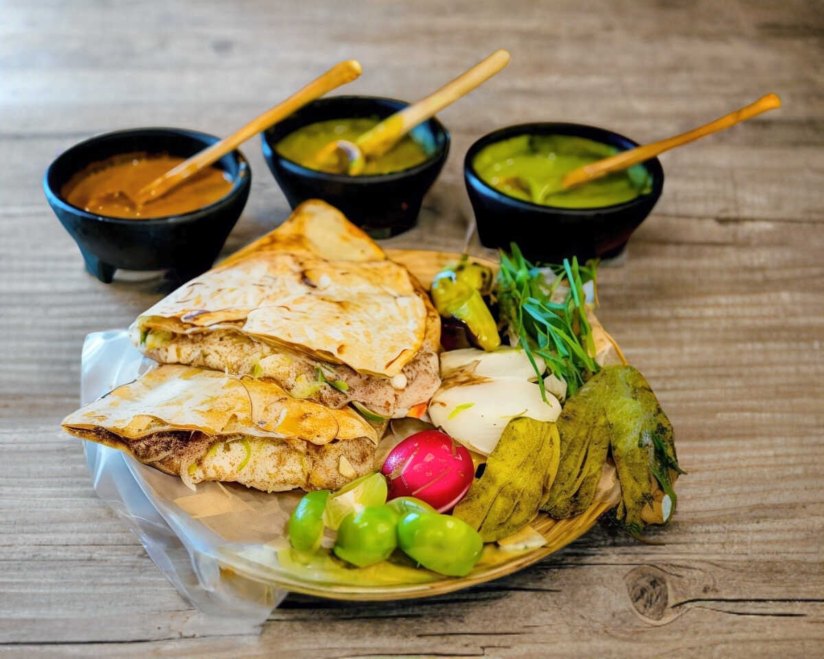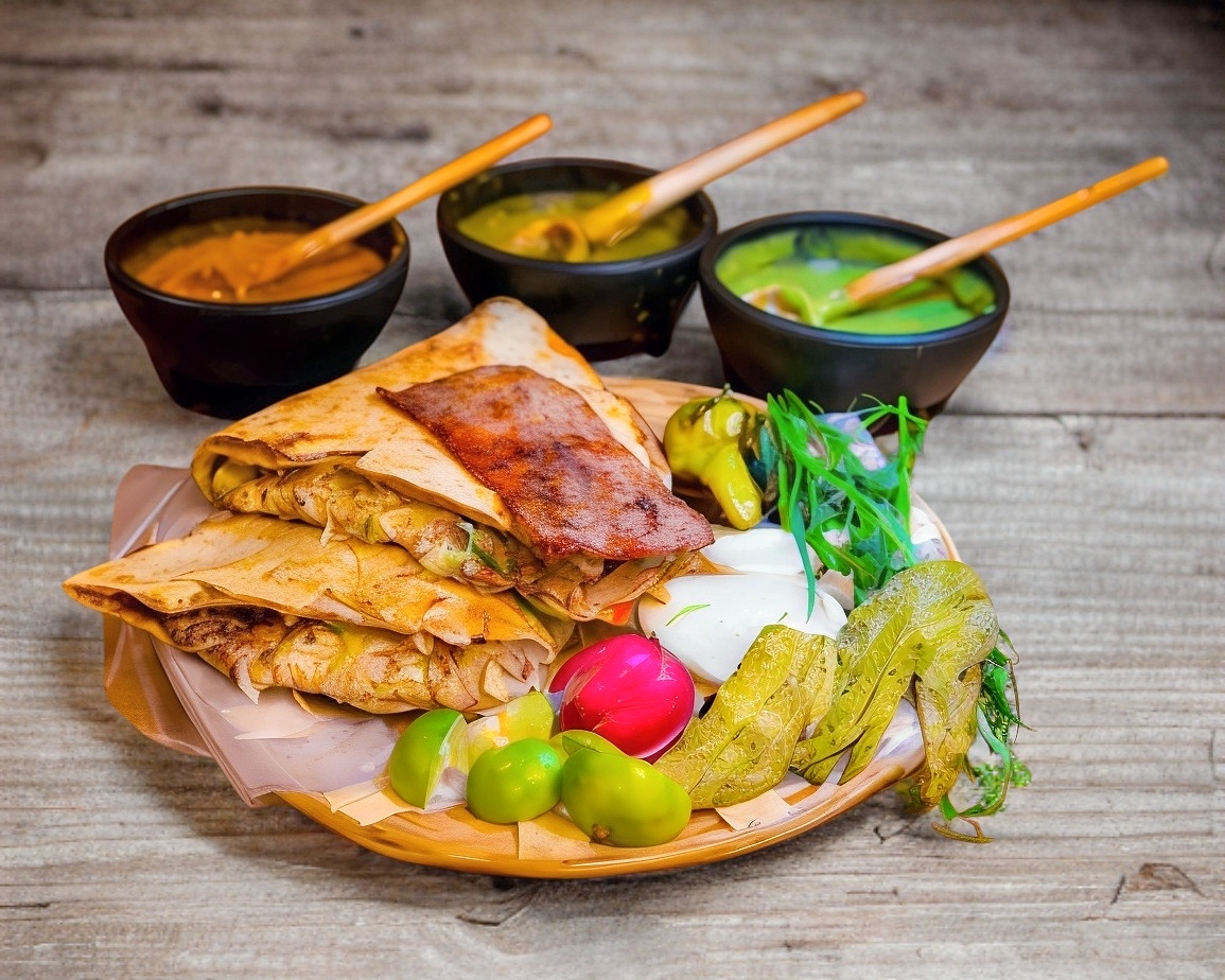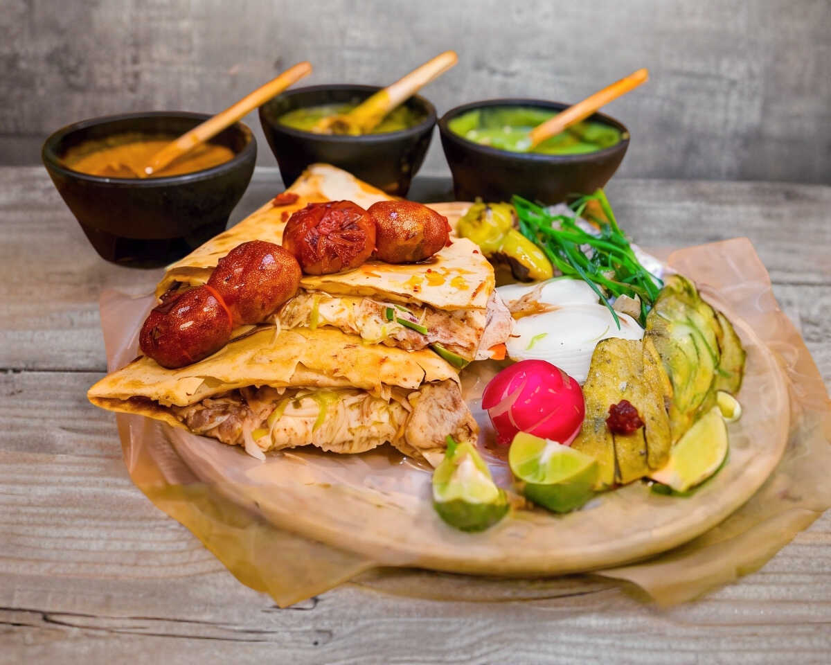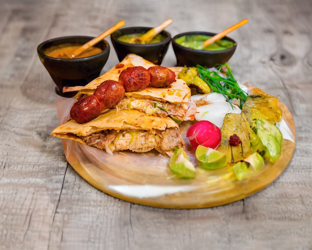 Doble tortilla de maíz gratinada con quesillo de crema, chorizo, cebolla frita y cilantro