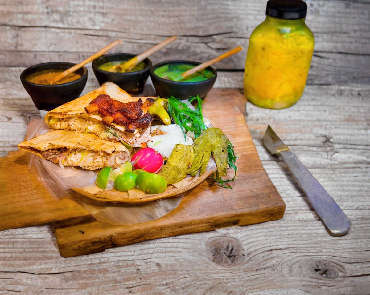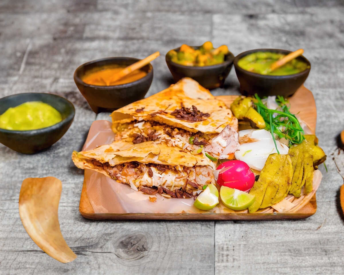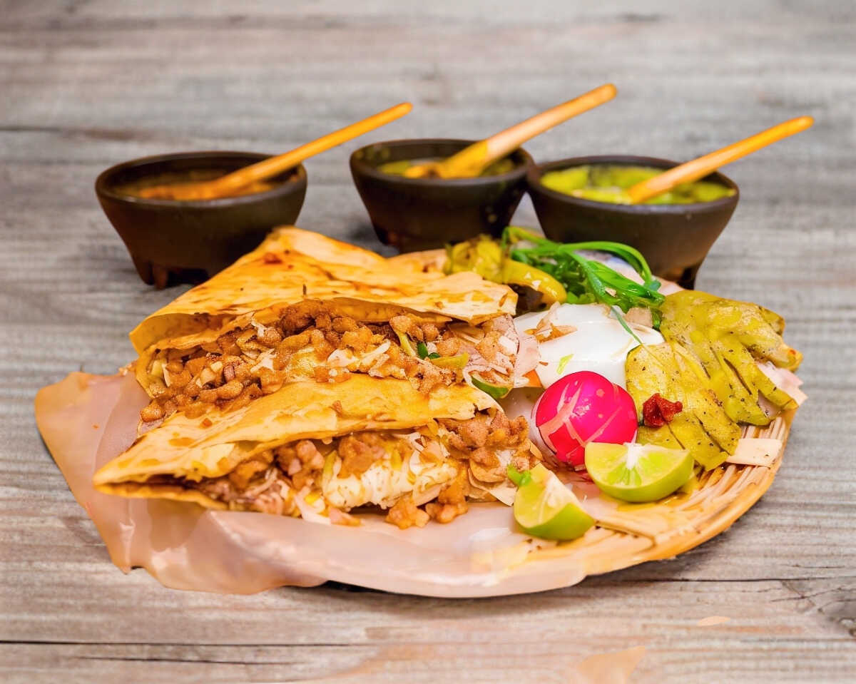 Doble tortilla de maíz gratinada con quesillo de crema, campechano (tripa, tasajo, costilla y chorizo), cebolla frita y cilantro